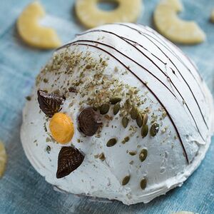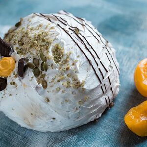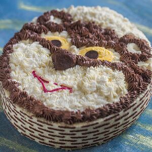 Изумительные воздушно-ореховые коржи из мелкодробленого ореха фундука, яичного белка, сахара и рисовой муки. Коржи прослоены нежным сливочным кремом от отборного сливочного масла с добавлением варёного сгущённого молока. Поверхность торта - орехово-шоколадной пастой и украшена орехами грецкий, фундук и кешью. Грецкий орех сверху прикрыт скорлупой из натурального темного шоколада. Скорлупа украшена сухим пищевым красителем Кандурин - золото. Боковые стороны украшены лепестками миндаля. Пищевая ценность в 100 г продукта (среднее значение на 100 г продукта): белки - 6,3 г; жиры 33,1 г; углеводы 39,5 г Энергетическая ценность: 481 ккал / 2015 кДж