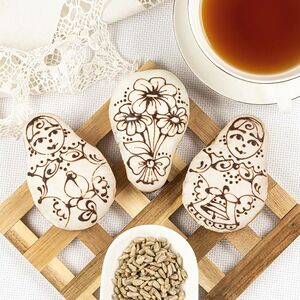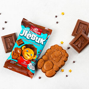 Печенье двухслойное, одна половинка печенья имеет круглое отверстие, через которое видна начинка из апельсина и лимона. Печенье формой в виде цветочка, с серединкой из начинки.