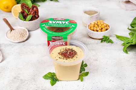 Полезная и питательная закуска, любимая на Ближнем Востоке. В основе богатый белком нут, паста из отборного кунжута, оливковое масло и сок из свежих лимонов. Кунжутная паста только собственного изготовления - все витамины и микроэлементы максимально сохранены. Хумус - идеальное блюдо для здорового питания: источник легкоусвояемого растительного белка, кладезь витаминов и микроэлементов. Подходит для веганов. Яркий вкус вяленых томатов и ароматный базилик - незабываемое сочетание.