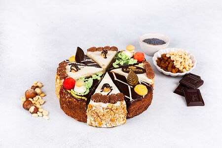 Торт состоит из трех видов тортов Прага 2 шт., Ореховый- 4 шт. и Лесная поляна 2 шт. Украшение соответствует украшению тортов.