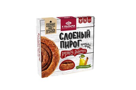 Традиционный греческий пирог из слоеного теста в форме большой улитки. Воздушное слоеное тесто из 256 слоев обладает особенно тонким вкусом и прекрасно сочетается с начинкой из сладкой спелой груши и ароматной молотой корицы. Сверху пирог щедро посыпан пряной молотой корицей. Благодаря оригинальной форме начинка равномерно распределана по пирогу. Слоеный пирог от Палыча - крафтовый пирог, изготовленный вручную, без красителей и улучшителей.