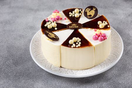 Воздушное сливочное суфле с настоящим сгущенным молоком без заменителей молочных жиров и два нежных песочно-сдобных коржа на сметане. Торт порционный, украшен сливочно-шоколадным кремом, темным и белым шоколадом.