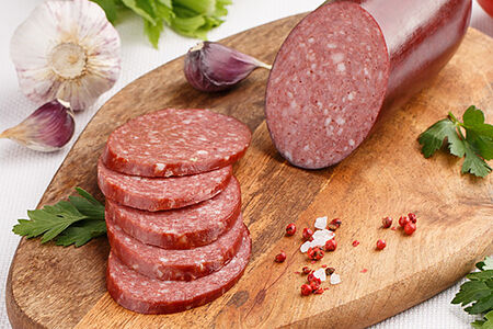 Сервелат мы изготавливаем по рецептуре ГОСТа. Его особенностью является мелкозернистая структура фарша из говядины, свинины и свиной грудинки с добавлением соли и ароматного черного перца. Наш сервелат сочный, в меру жирный. По содержанию мышечных волокон мяса (только мясо говядины, свинины, без шпика и птицы) наш Сервелат относится к категории А.
