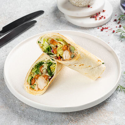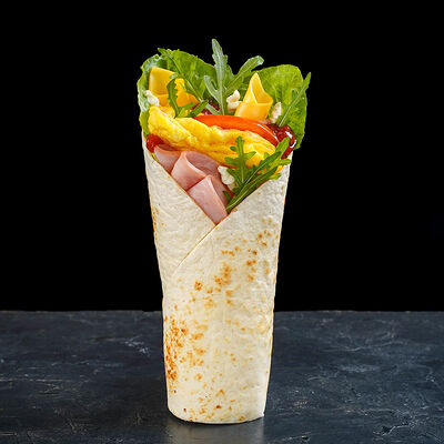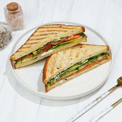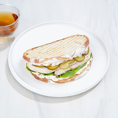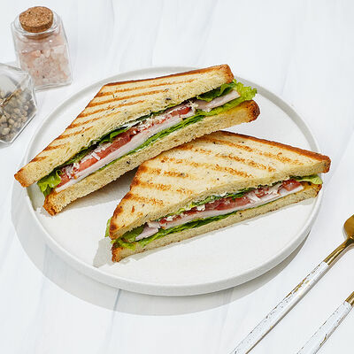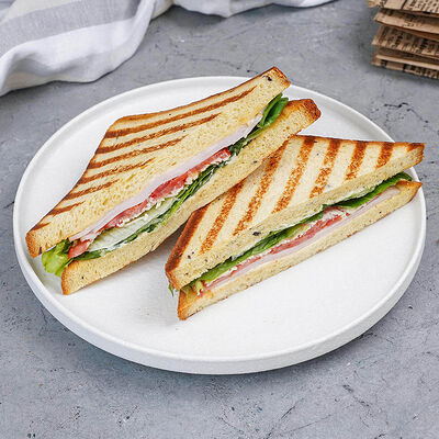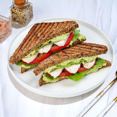 Сытный и питательный сэндвич из бездрожжевого пшеничного хлеба, запеченной груди индейки, отварного куриного яйца, вяленных томатов, маринованных огурцов, салата романо, мойонеза и соуса Релиш