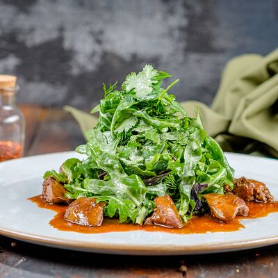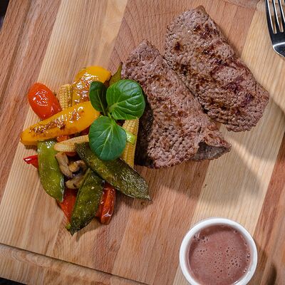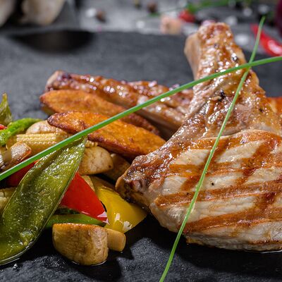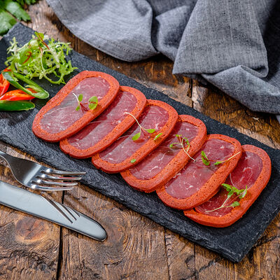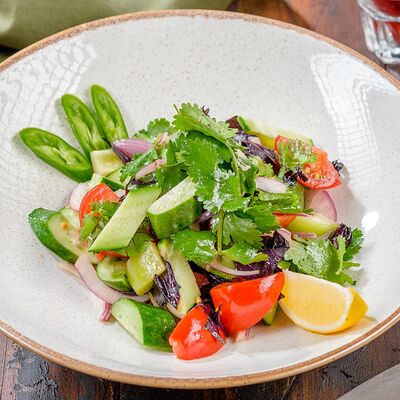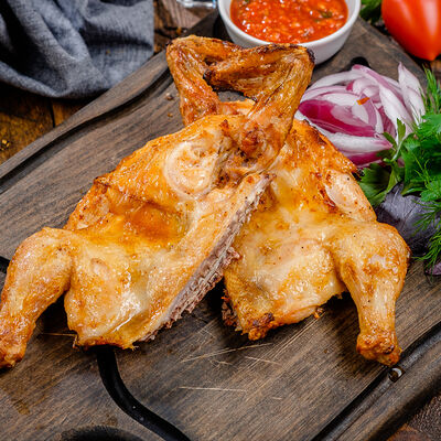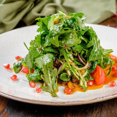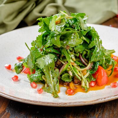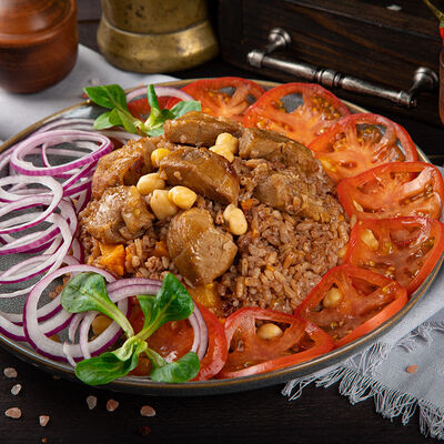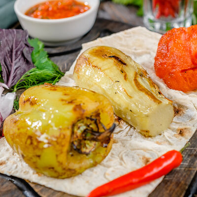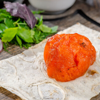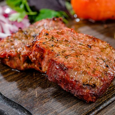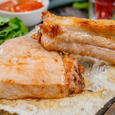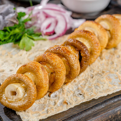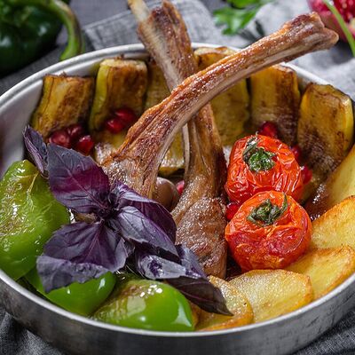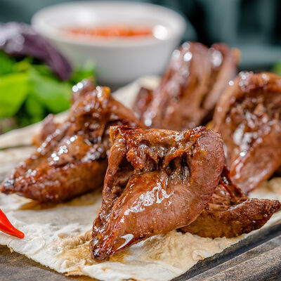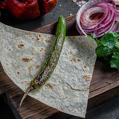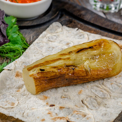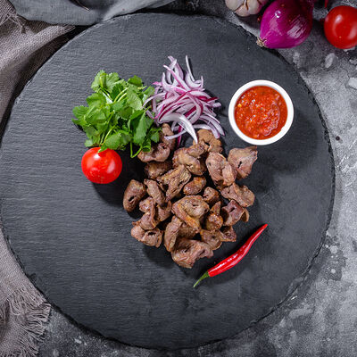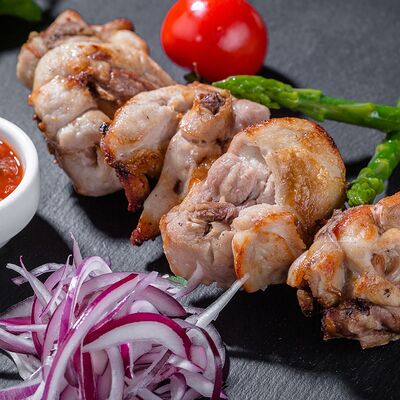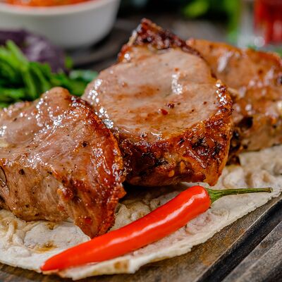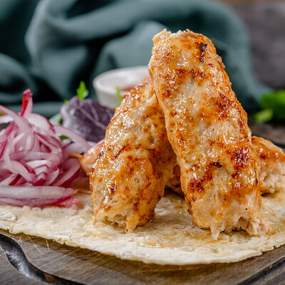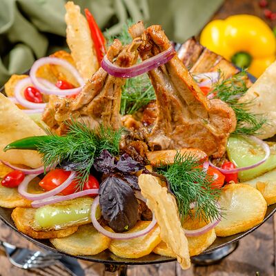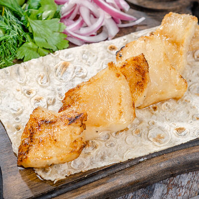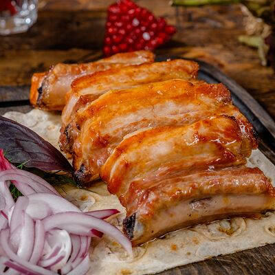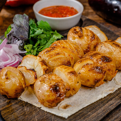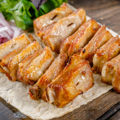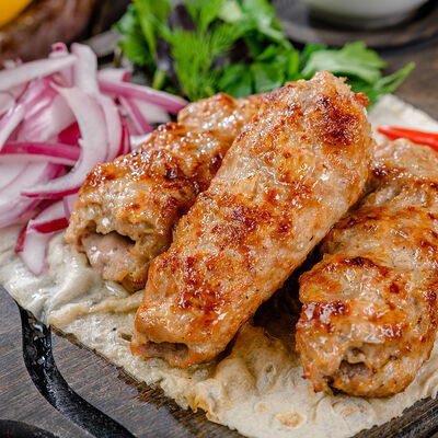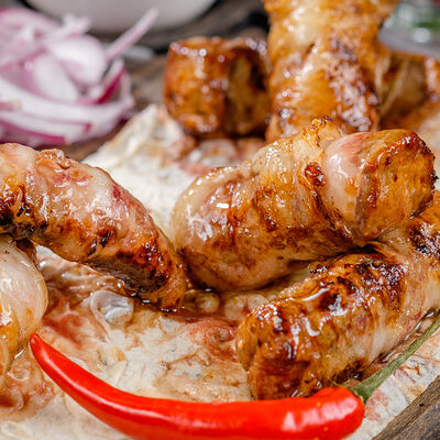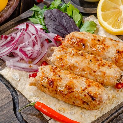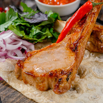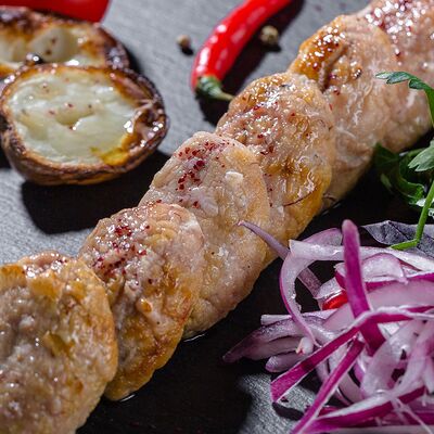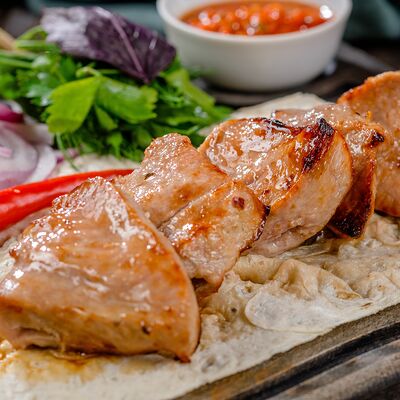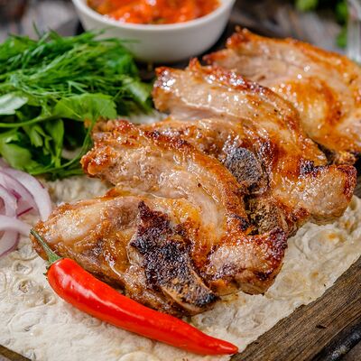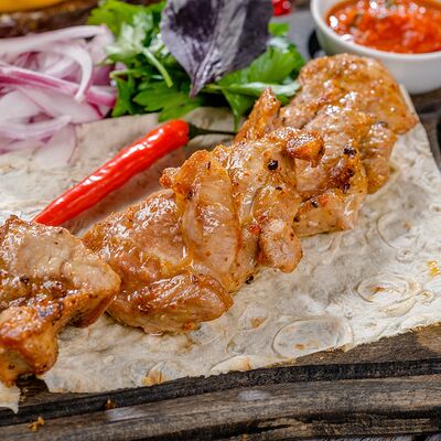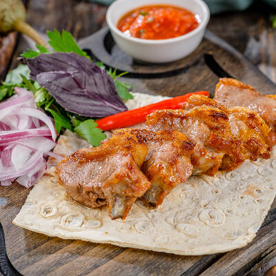 Баранина почечная часть, соль, лаваш, лук красный репчатый, укроп, петрушка, рейхан, аджика домашняя (морковь, петрушка, чеснок, перец болгарский, перец чили, масло кукурузное, соль, паприка красная сушеная, томатная паста)