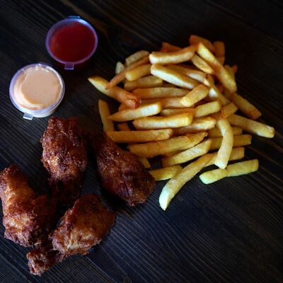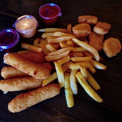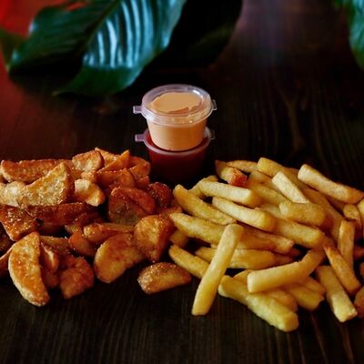 Картошка фри (1 порция), картофельные дольки (1 порция), соус сырный (1 шт.), кетчуп (1 шт.)