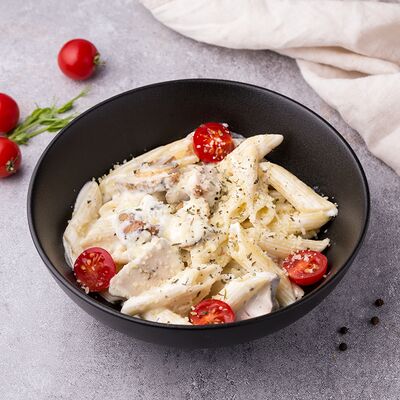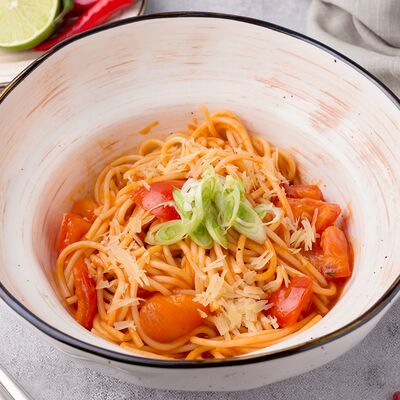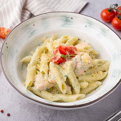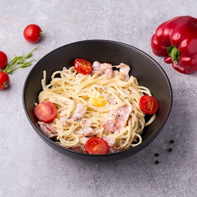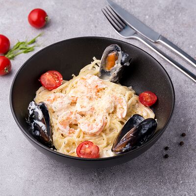 Спагетти, креветки королевские, сливки, прованские травы, масло оливковое, чеснок, соль, пармезан, томаты черри, мидии