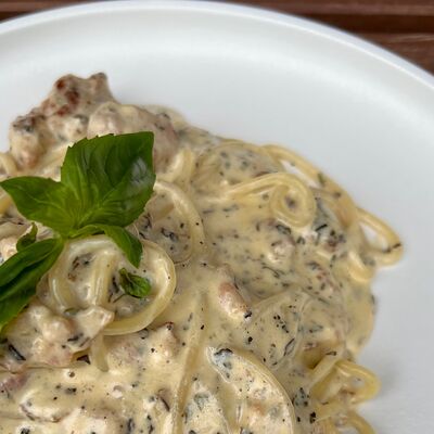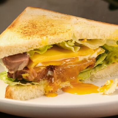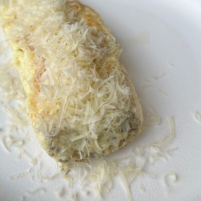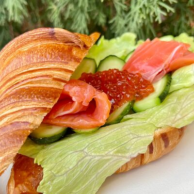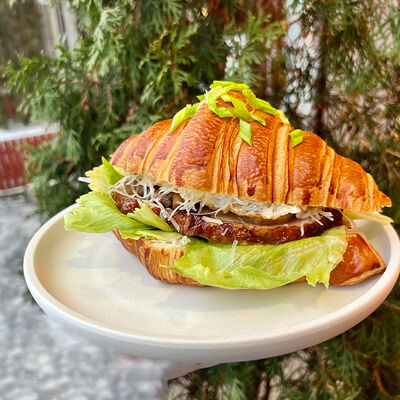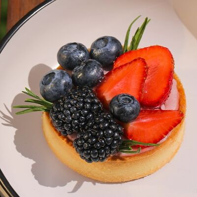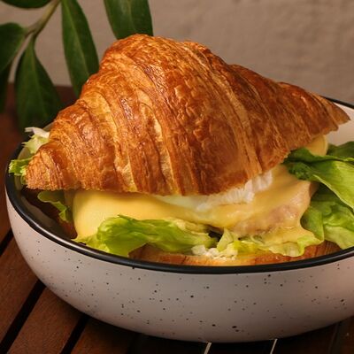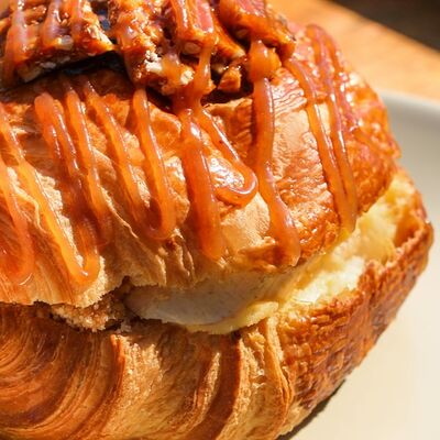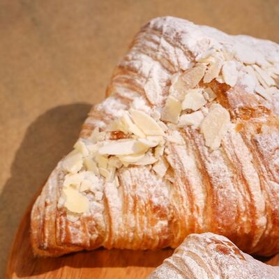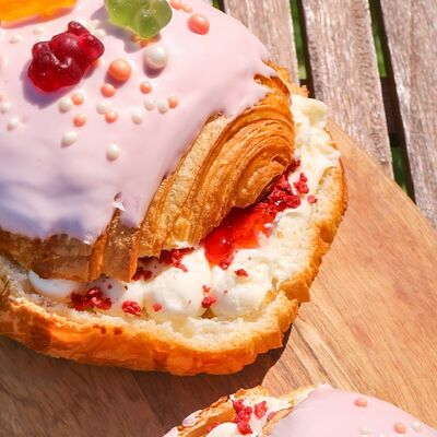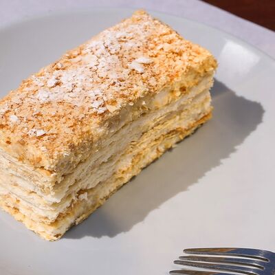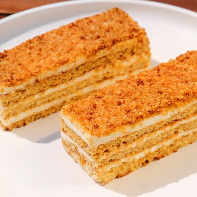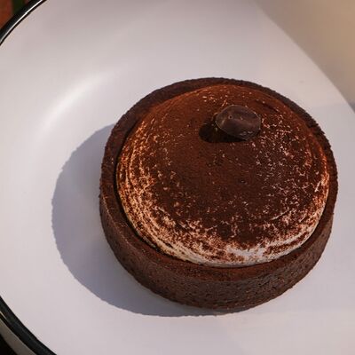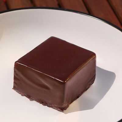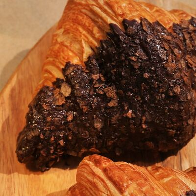 Слоеное дрожжевое тесто, шоколадный помадка, вафельная крошка, шоколадный крем ( сливки 33%, тёмный шоколад, желатин)