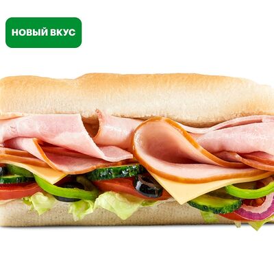 Начинка из бекона, ароматной индейки и ветчины с сыром на свежевыпеченном хлебе в комбинации с овощами и соусом на выбор