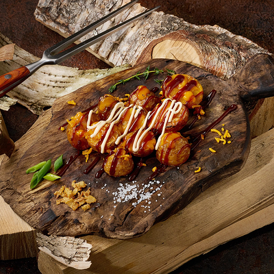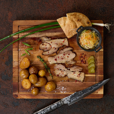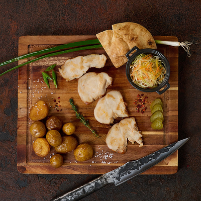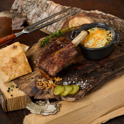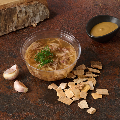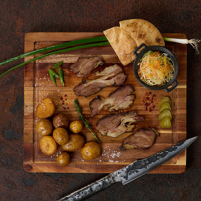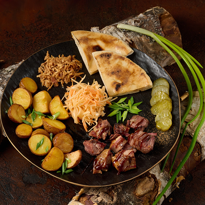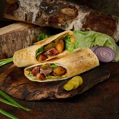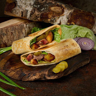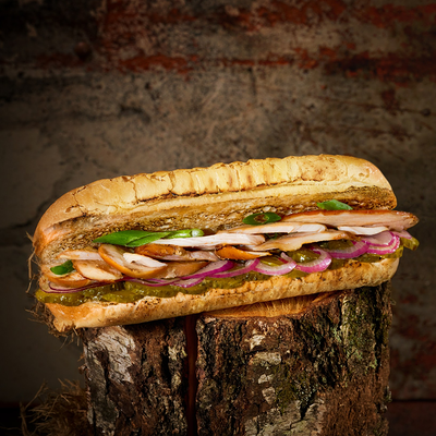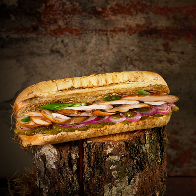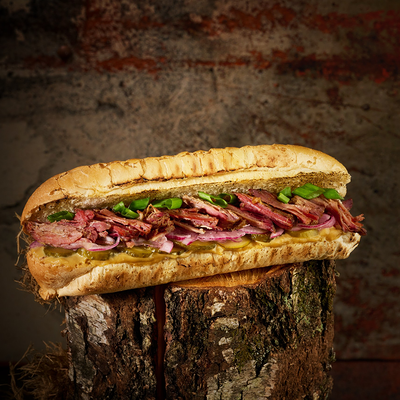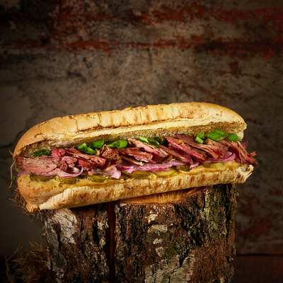 Подаем на ароматной бриоши с салатом айсберг, сыром чеддер, маринованным огурчиком и мясом под кисло сладким соусом