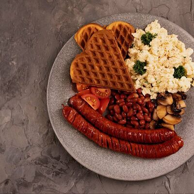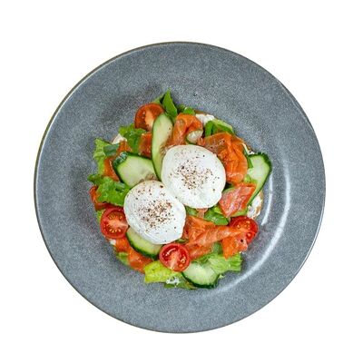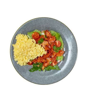 Яйцо, пепперони, жареный бекон, томат, домашняя аджика, соус фета, ромейн, томатное тесто