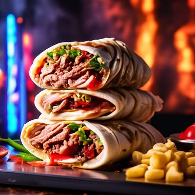 Тонкий хрустящий лаваш, сыр, сочная курица, помидоры, огурцы свежие, капуста свежая, фирменный соус чесночный