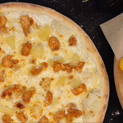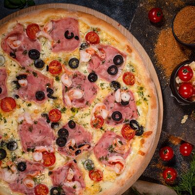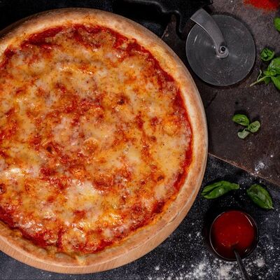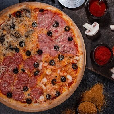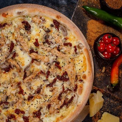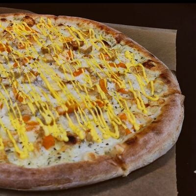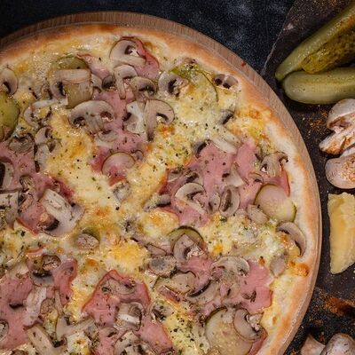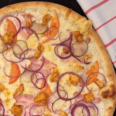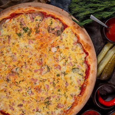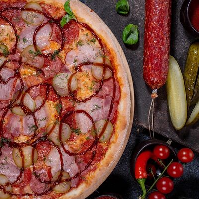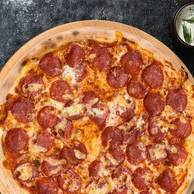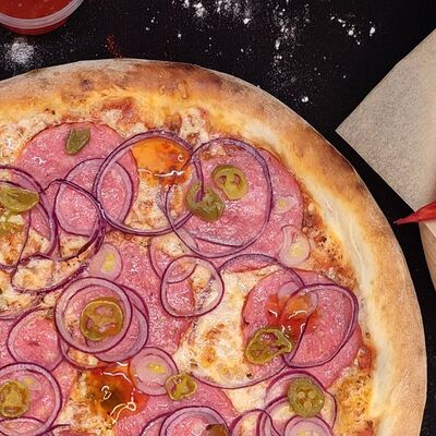 Сыры гауда и моцарелла, ароматная салями, красный лук и жгучий перчик халапеньо приправлены острым соусом, чесночным маслом и свежей зеленью