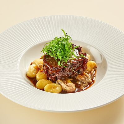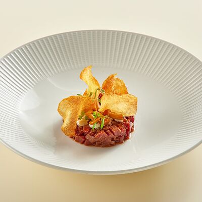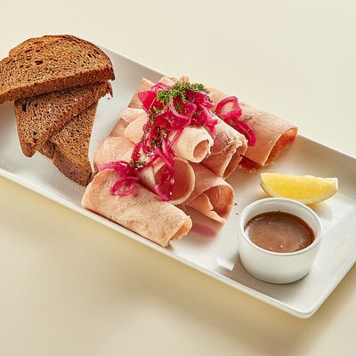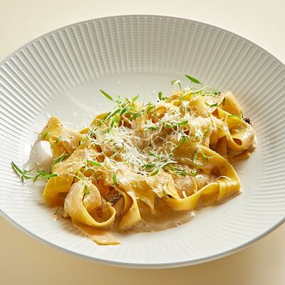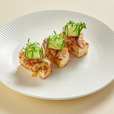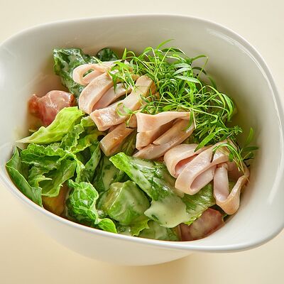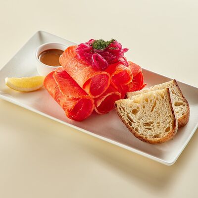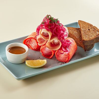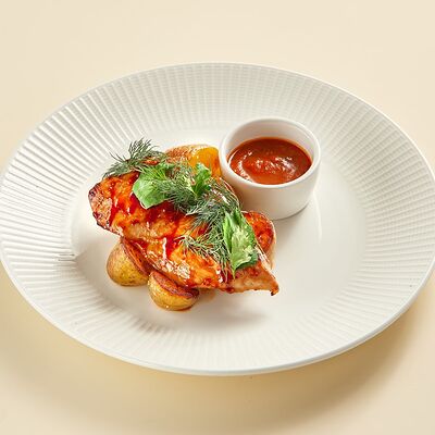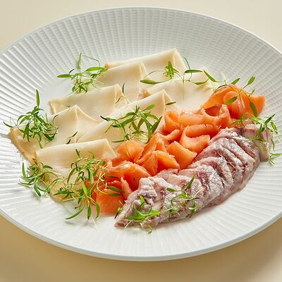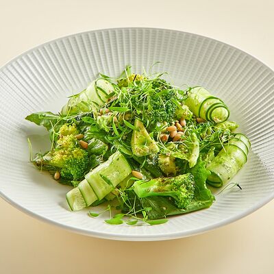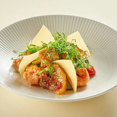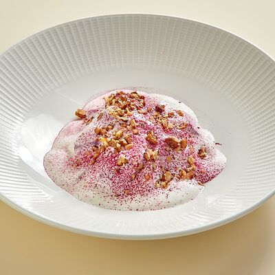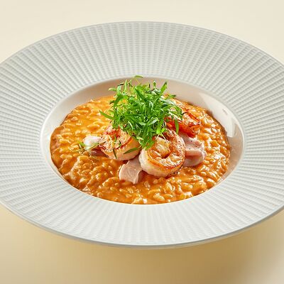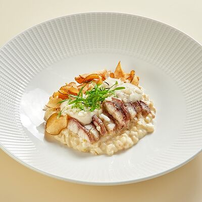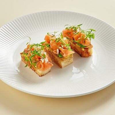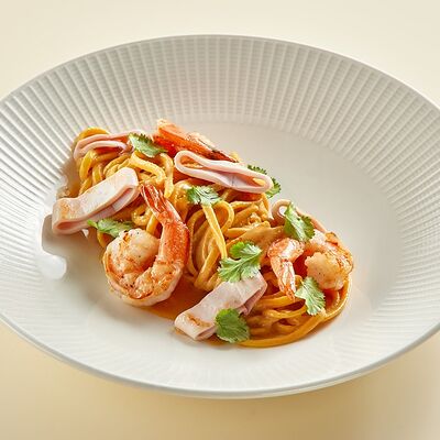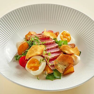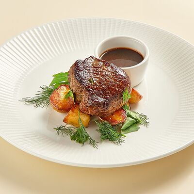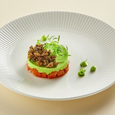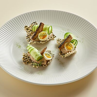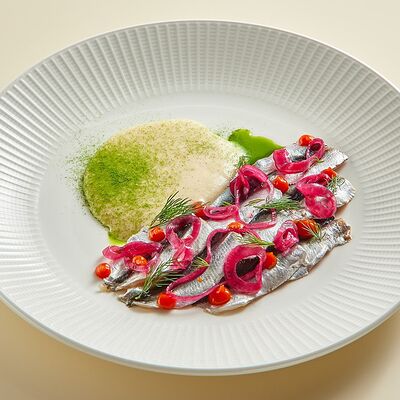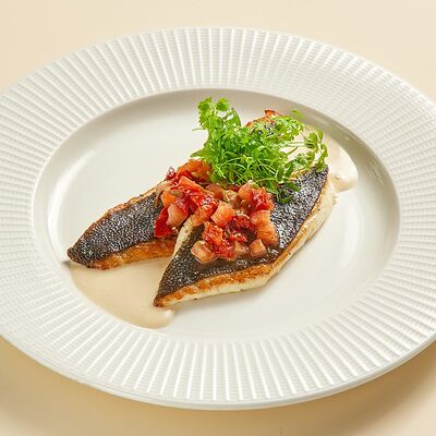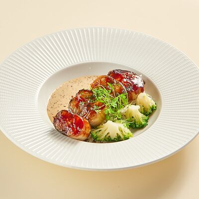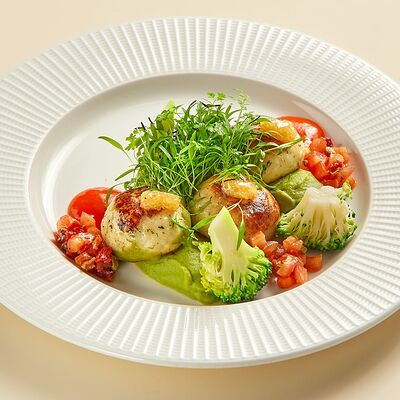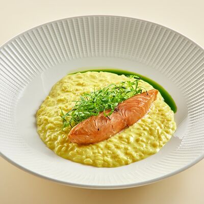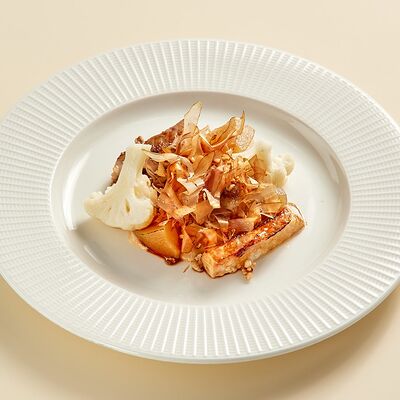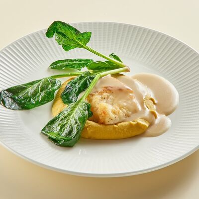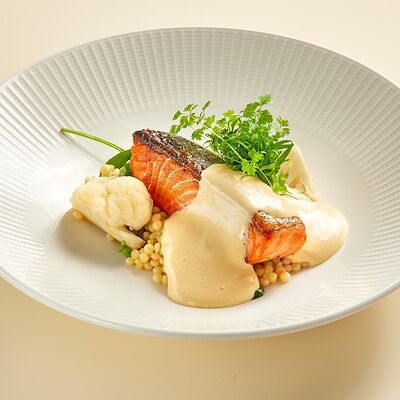 Филе лосося, птитим, цветная капуста, соус миссо-беарнез, шпинат, сливочная эмульсия, чеснок, масло сливочное