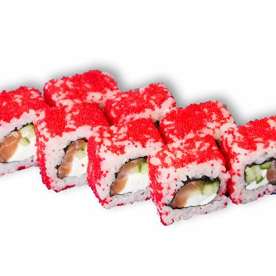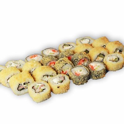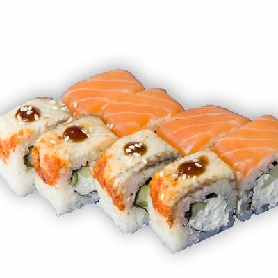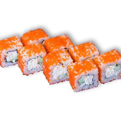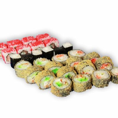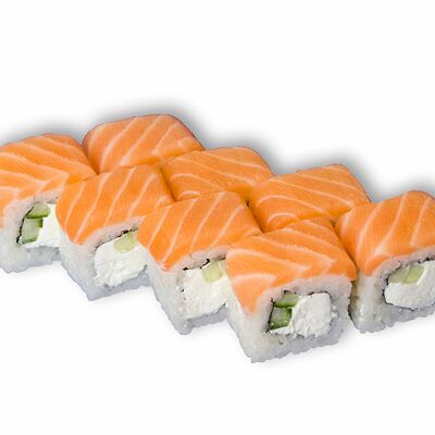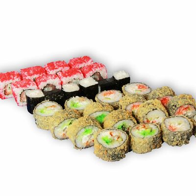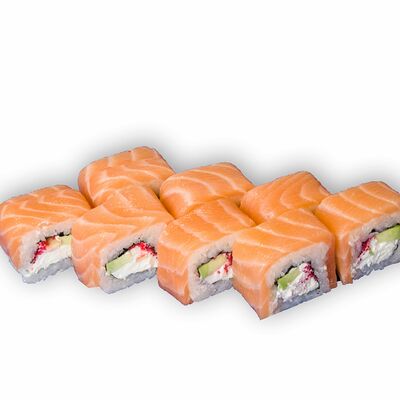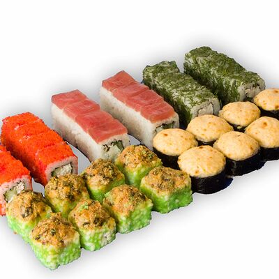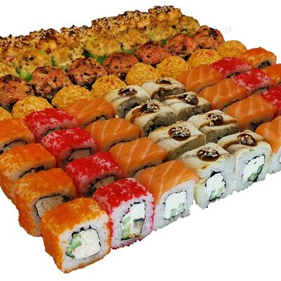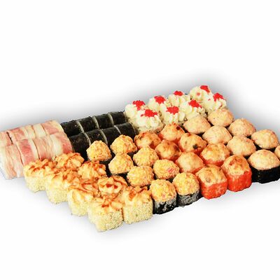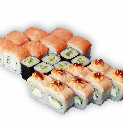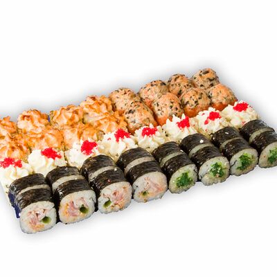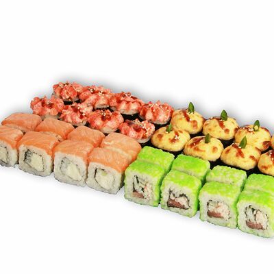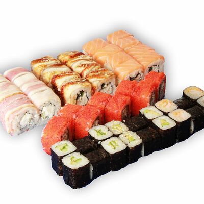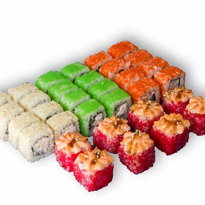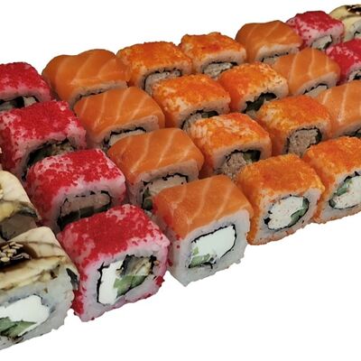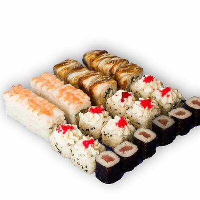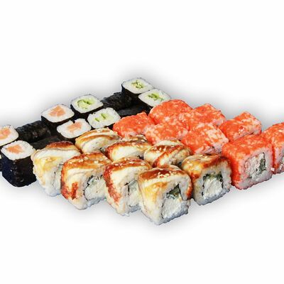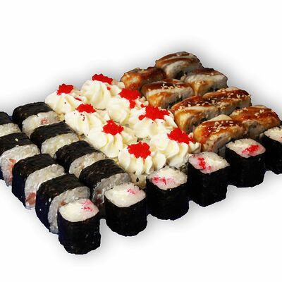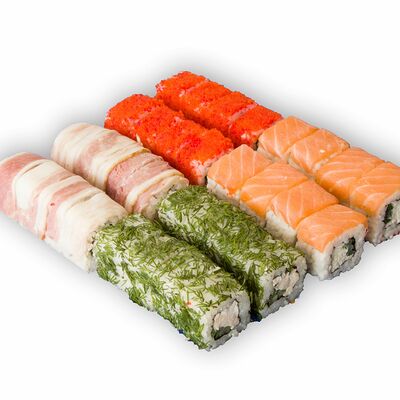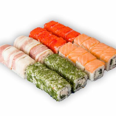 Филадельфия, калифорния оранж, мини острый эби, бекон ролл, филадельфия с угрем, каппа мини, авокадо мини. В наборе соевый соус (60 г), имбирь (30 г), васаби (10 г)