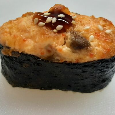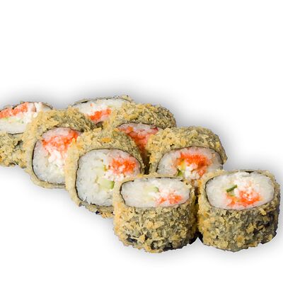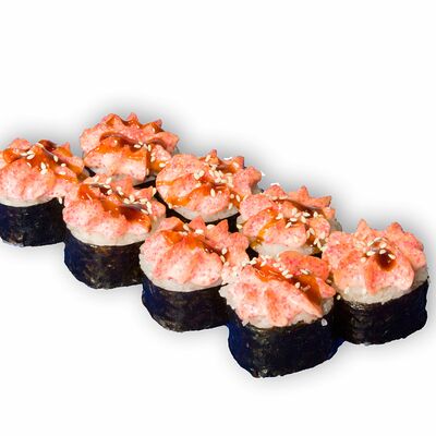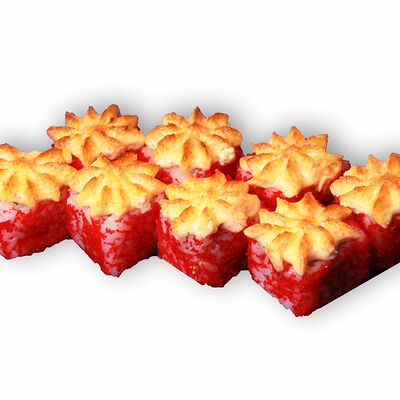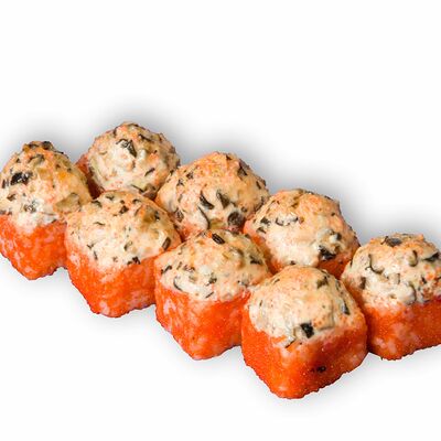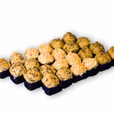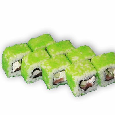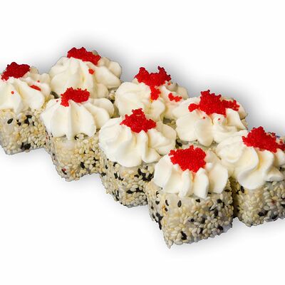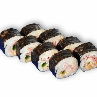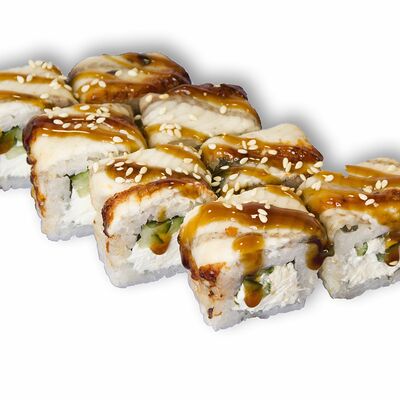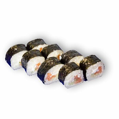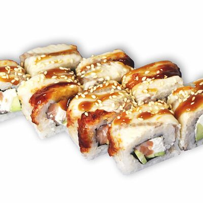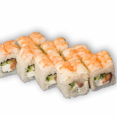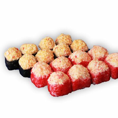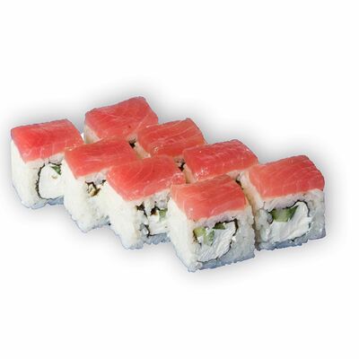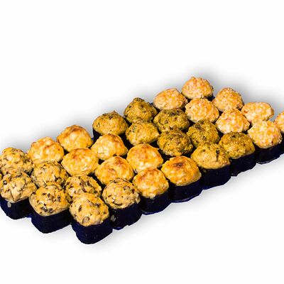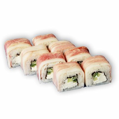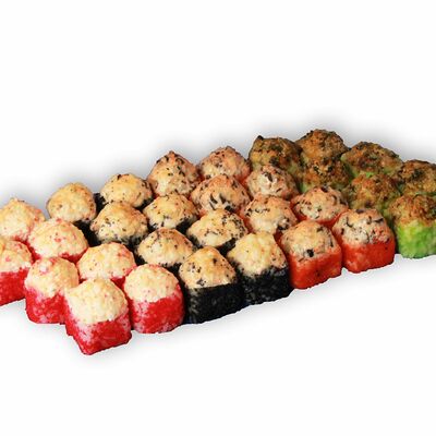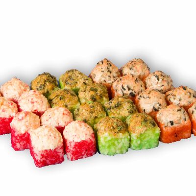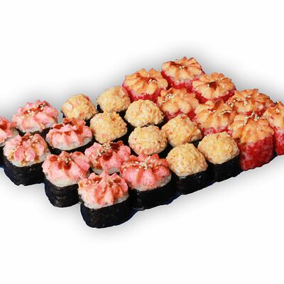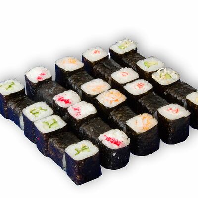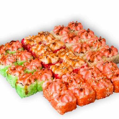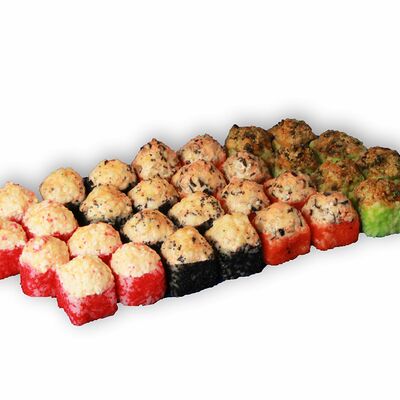 Филадельфия, калифорния оранж, мини острый эби, бекон ролл, филадельфия с угрем, каппа мини, авокадо мини. В наборе соевый соус (60 г), имбирь (30 г), васаби (10 г)
