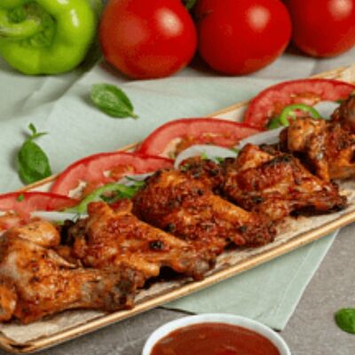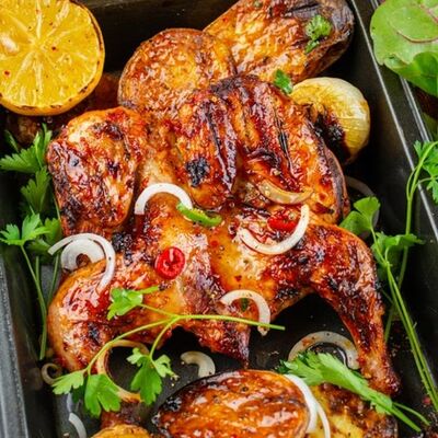 Куриная тушка, мёд, соевый соус, чеснок, соль пищевая, паприка. Подаётся с лавашем и луком