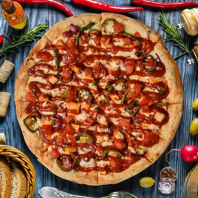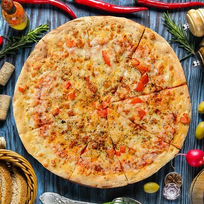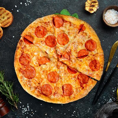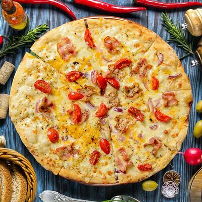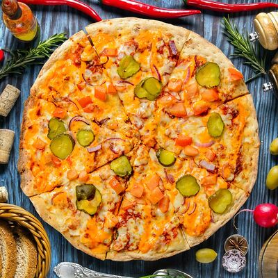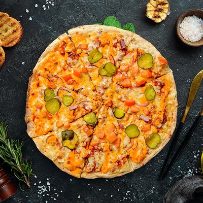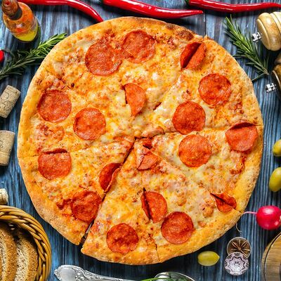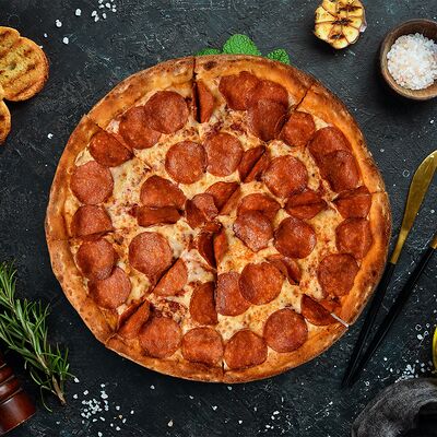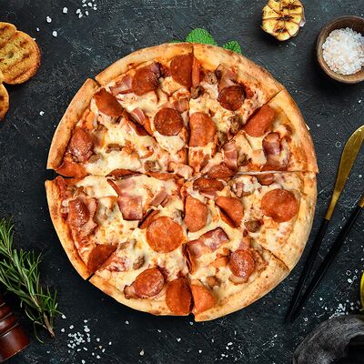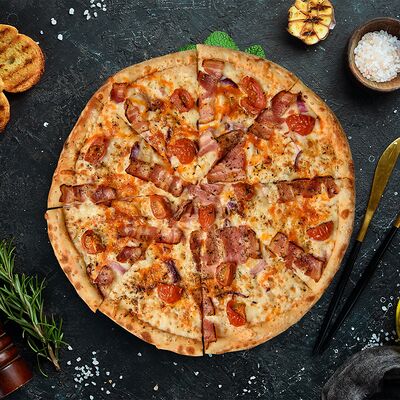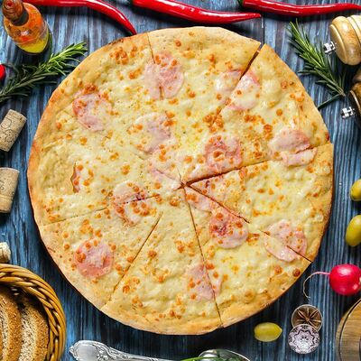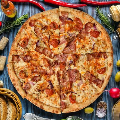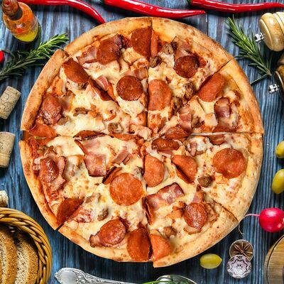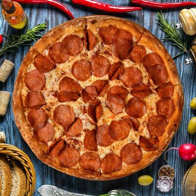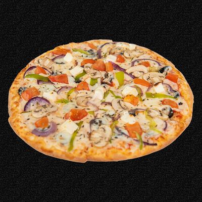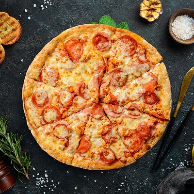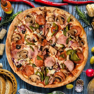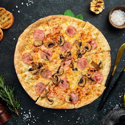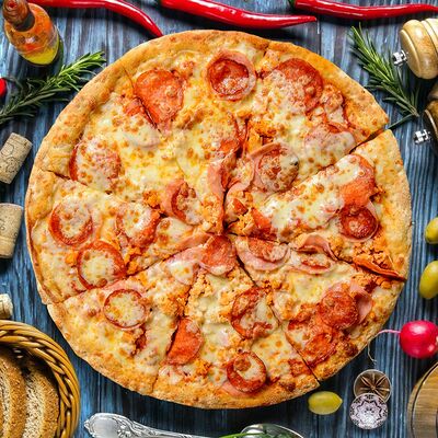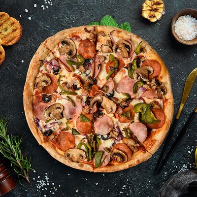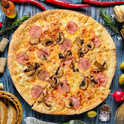 Ветчина, пикантная пепперони, томатный соус, шампиньоны, сладкий перец, красный лук, моцарелла, маслины (35 см)