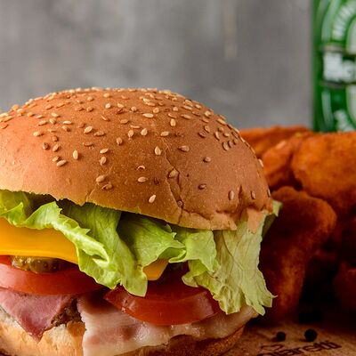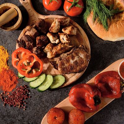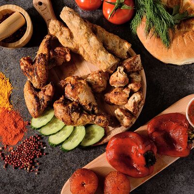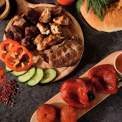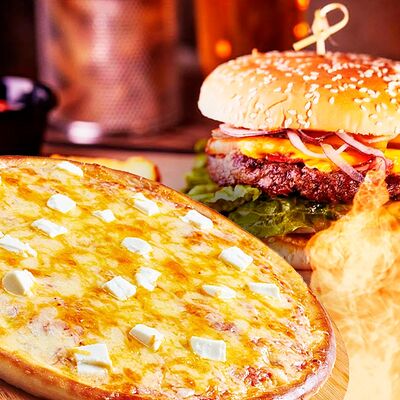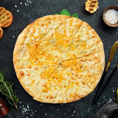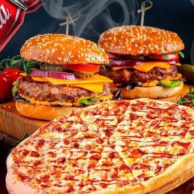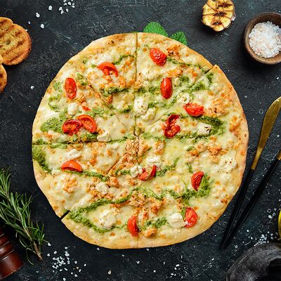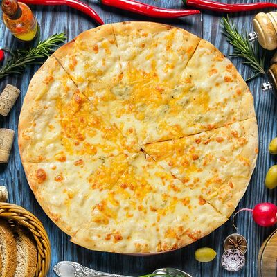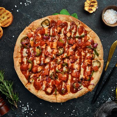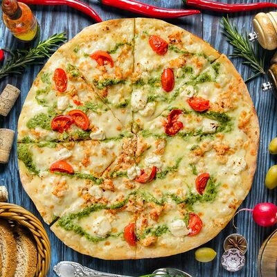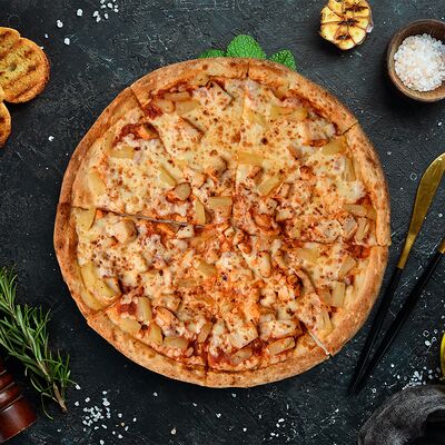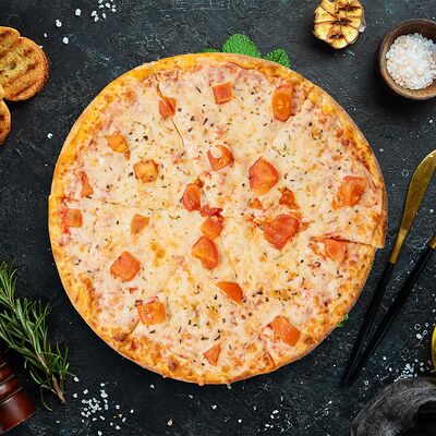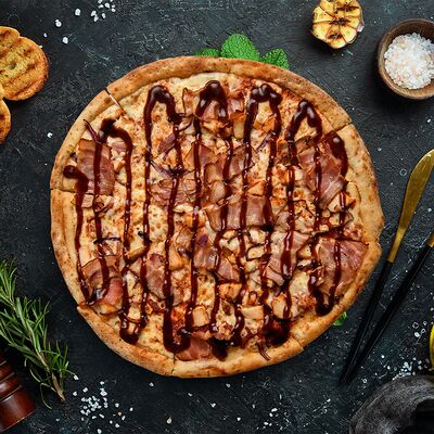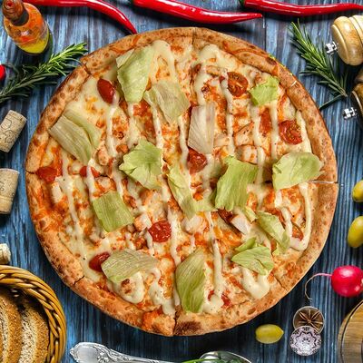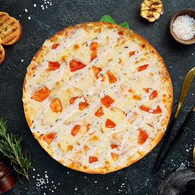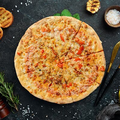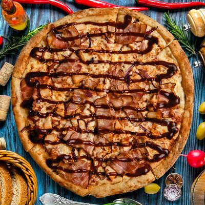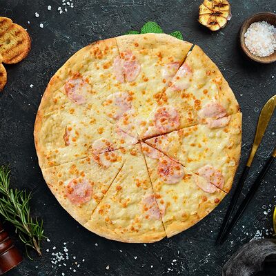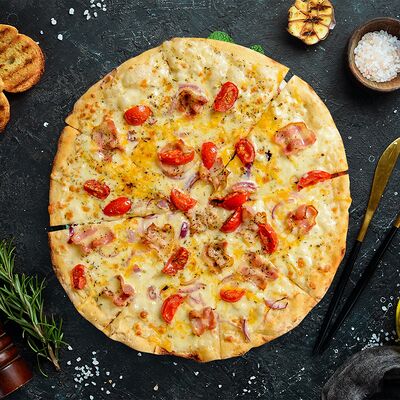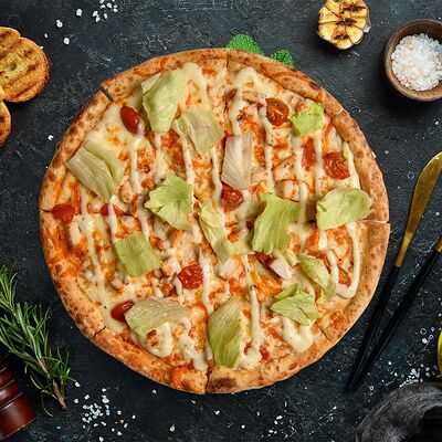 Ветчина, пикантная пепперони, томатный соус, шампиньоны, сладкий перец, красный лук, моцарелла, маслины (35 см)