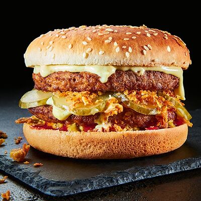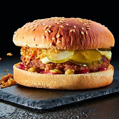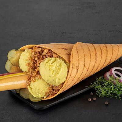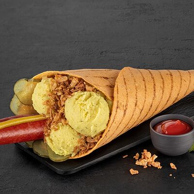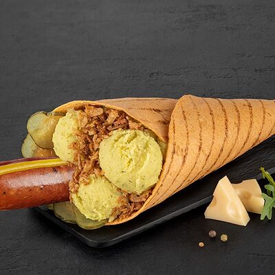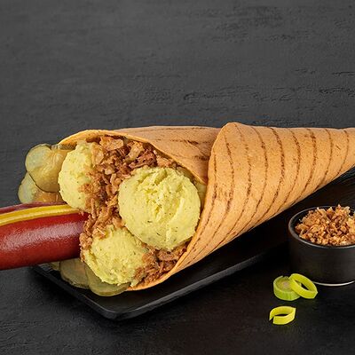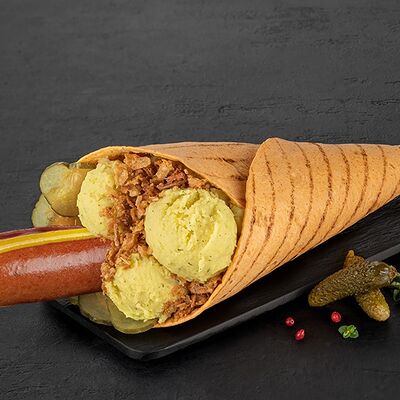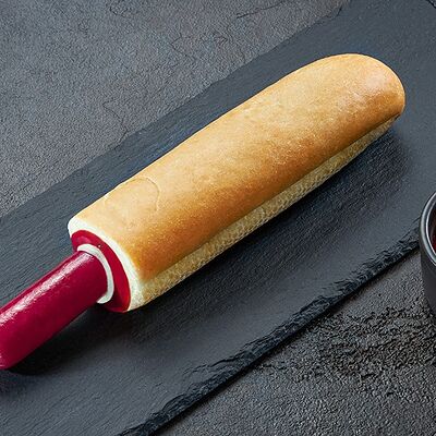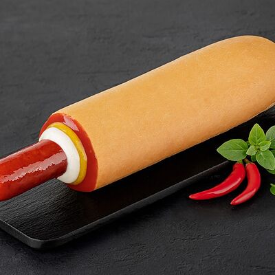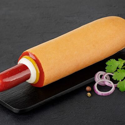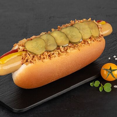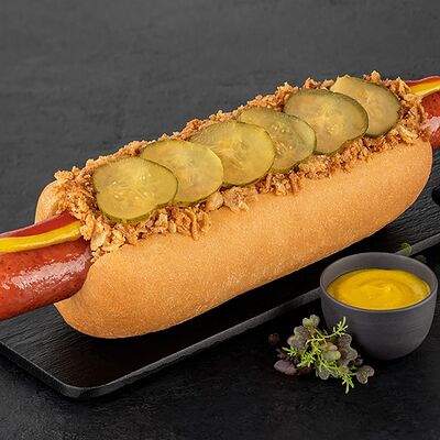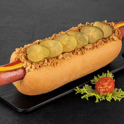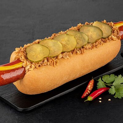 Булочка для датского хот-дога, колбаска утиная с яблоками, соус кисло-сладкий чили, лук жареный