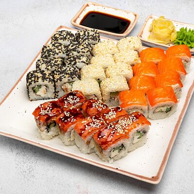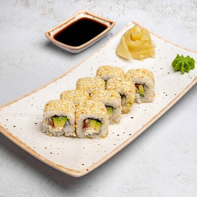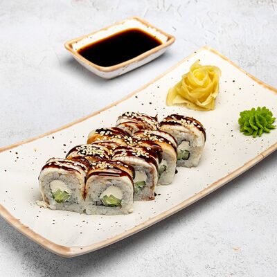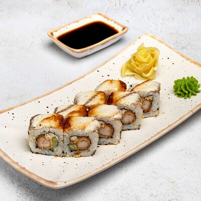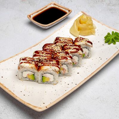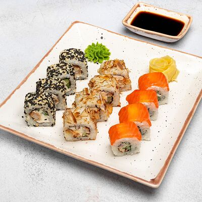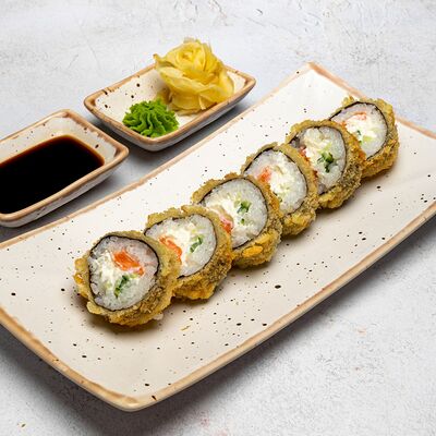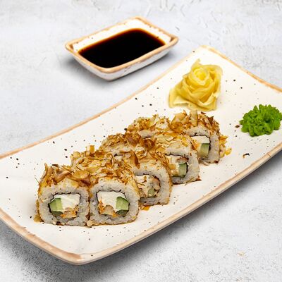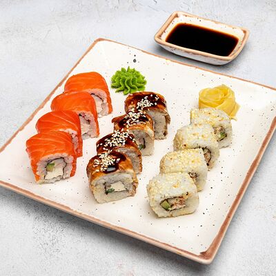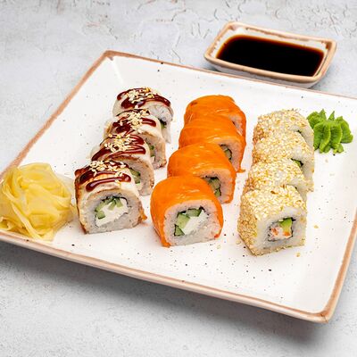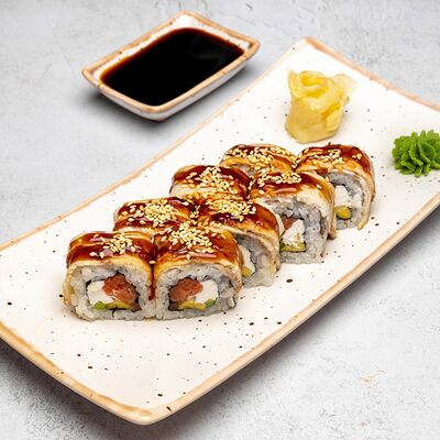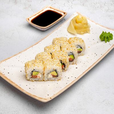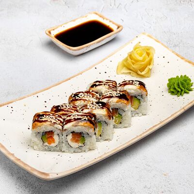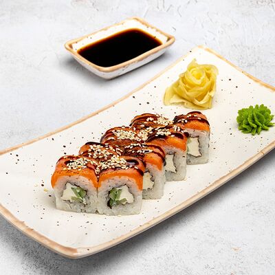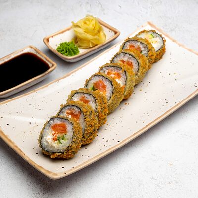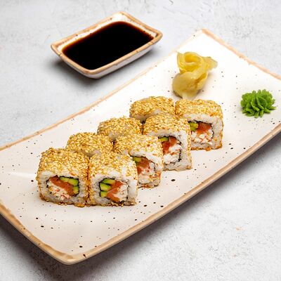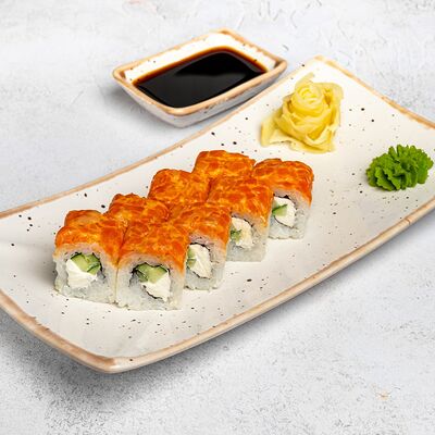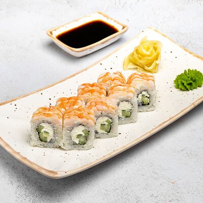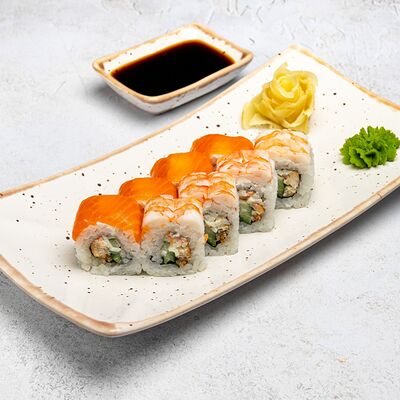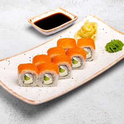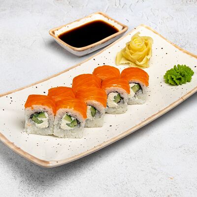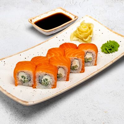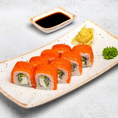 Популярный и всеми любимый ролл в исполнении двойной начинки из нежного творожного сыра и хрустящего огурца, покрытый мощными ломтиками слабосоленого лосося. Подается с соевым соусом, маринованным имбирем, васаби