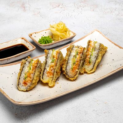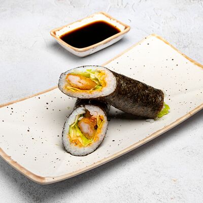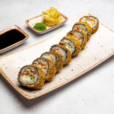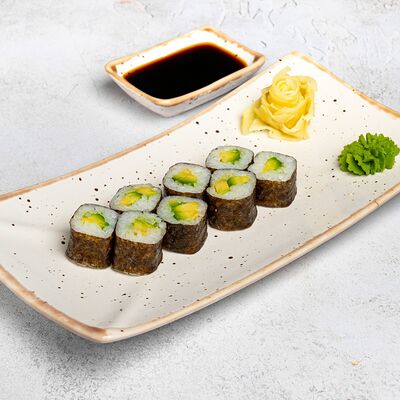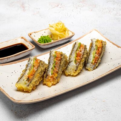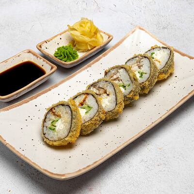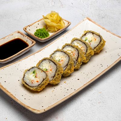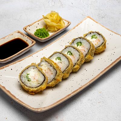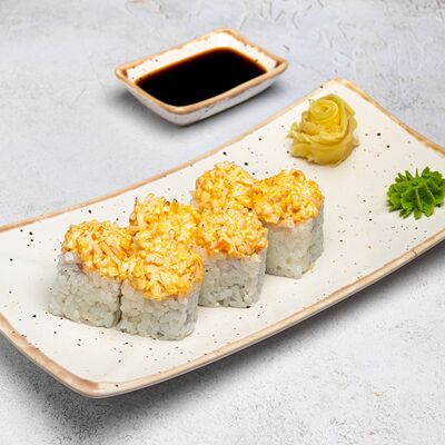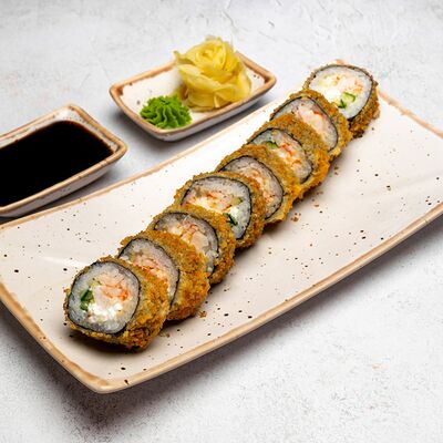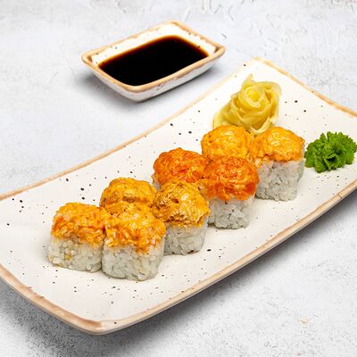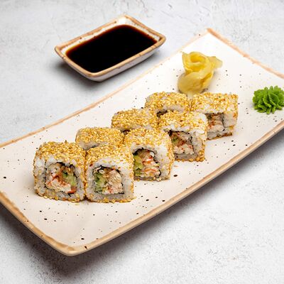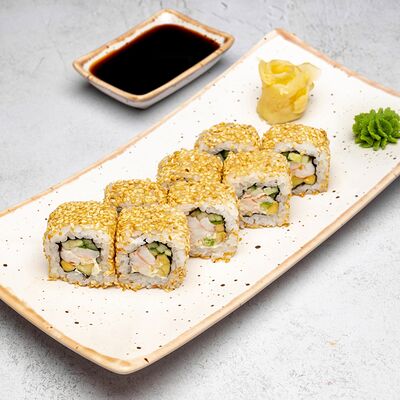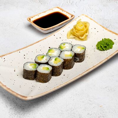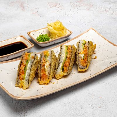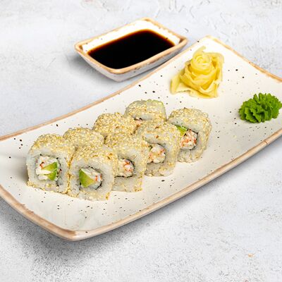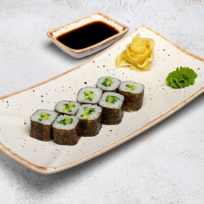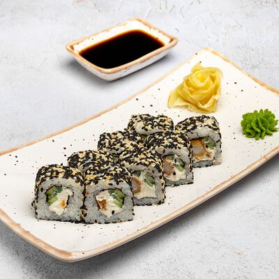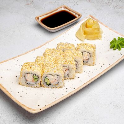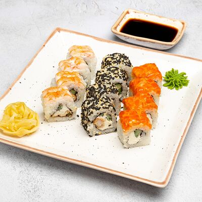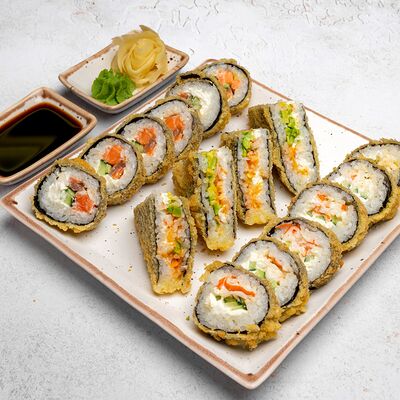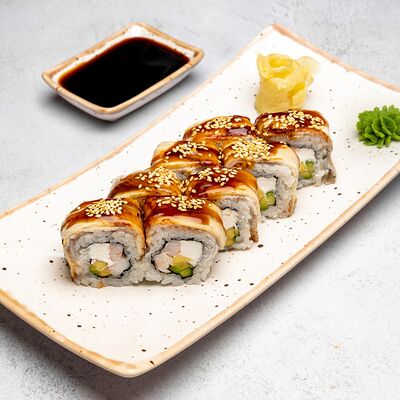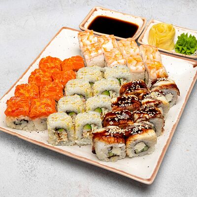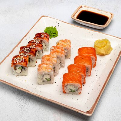 Популярный и всеми любимый ролл в исполнении двойной начинки из нежного творожного сыра и хрустящего огурца, покрытый мощными ломтиками слабосоленого лосося. Подается с соевым соусом, маринованным имбирем, васаби