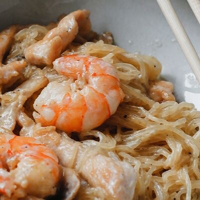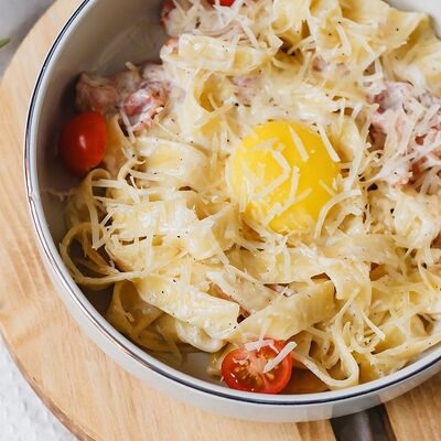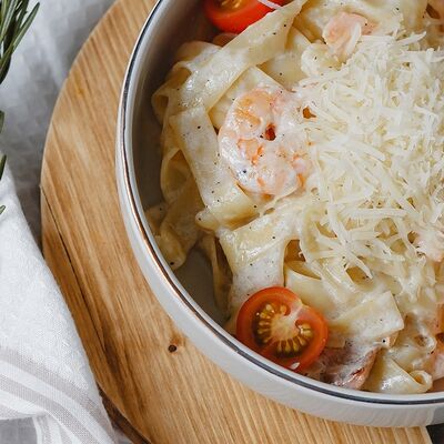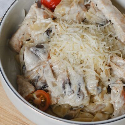 Паста с куриной грудкой и шампиньонами в сливочно-чесночном соусе с сыром пармезан