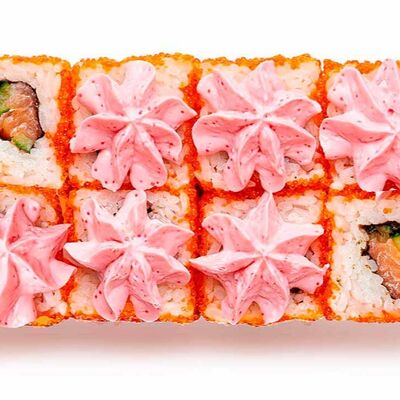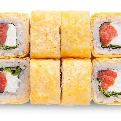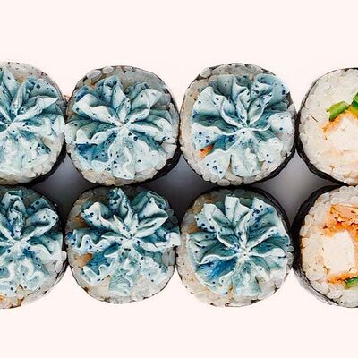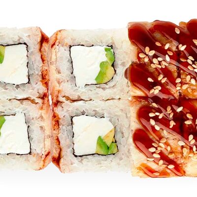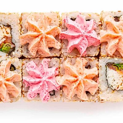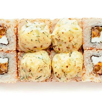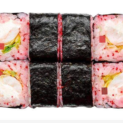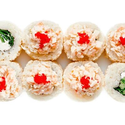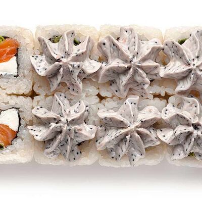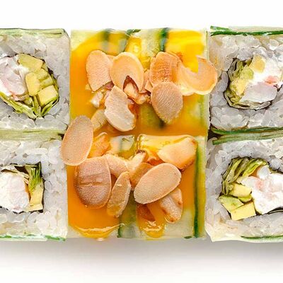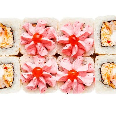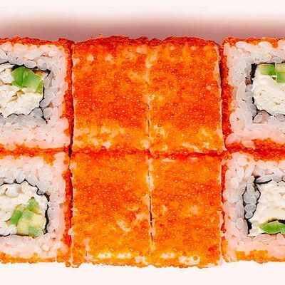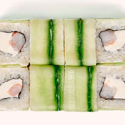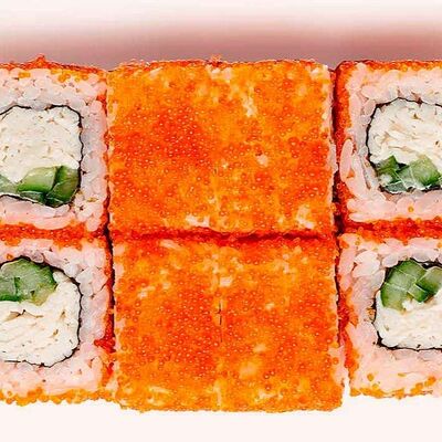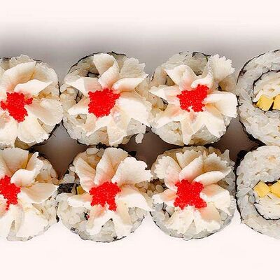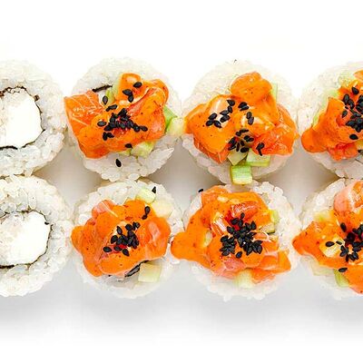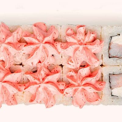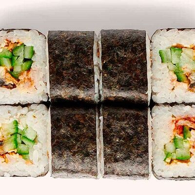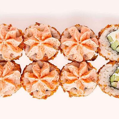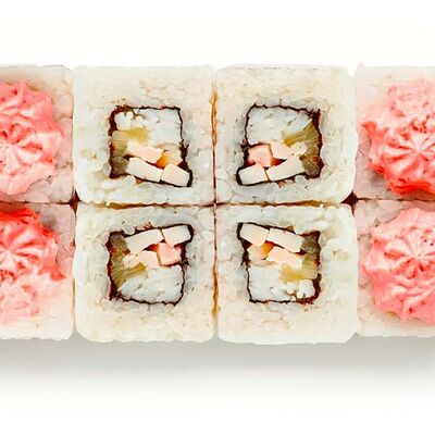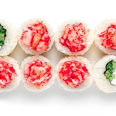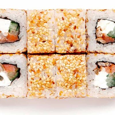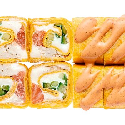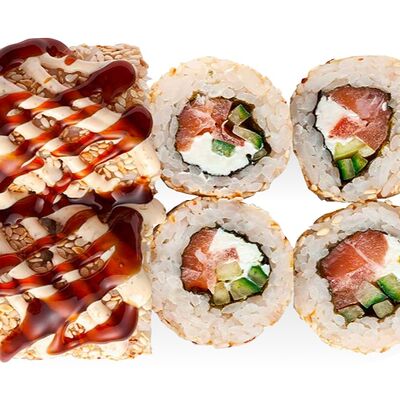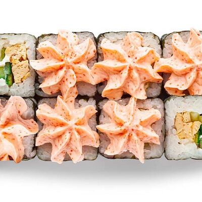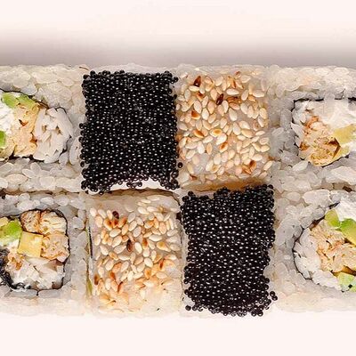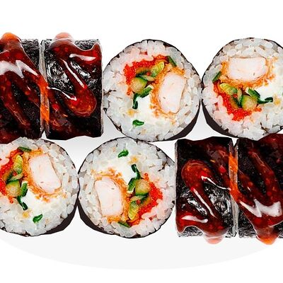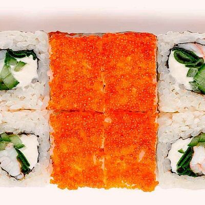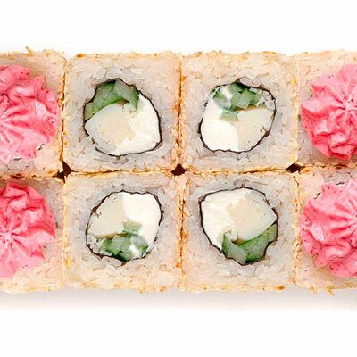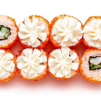 Огурец, тамаго, творожный сыр, соус лава с морским гребешком, рис