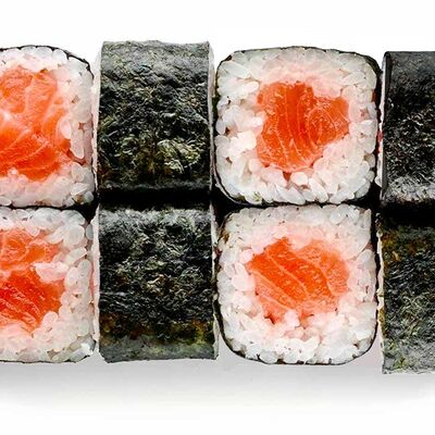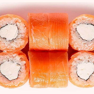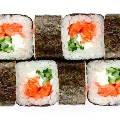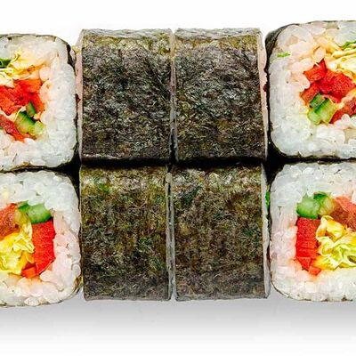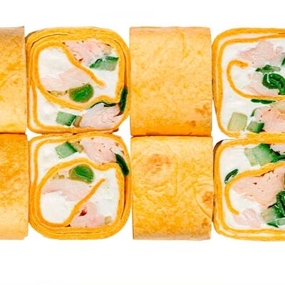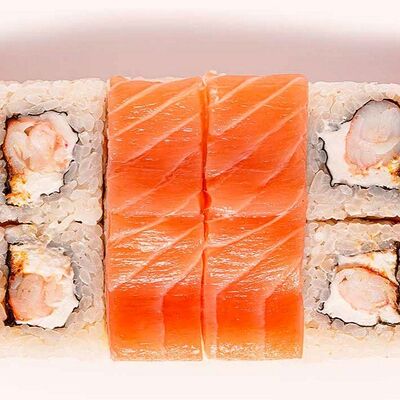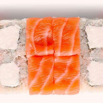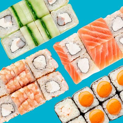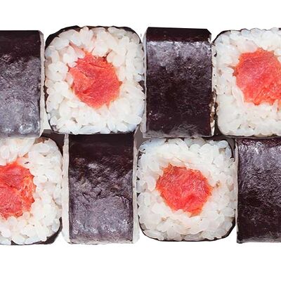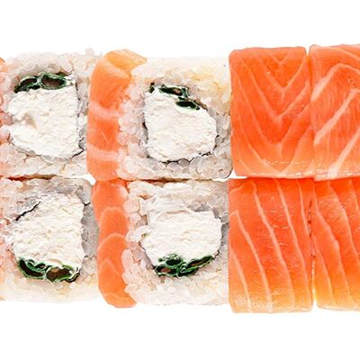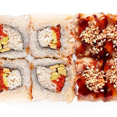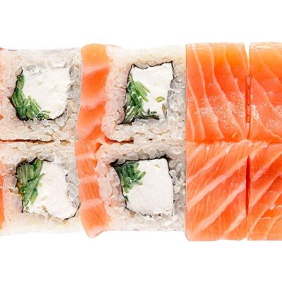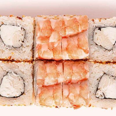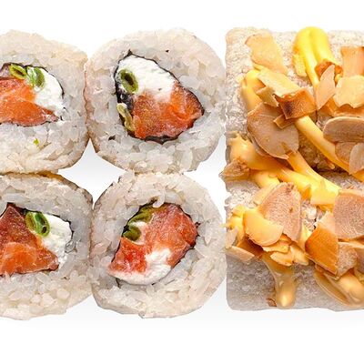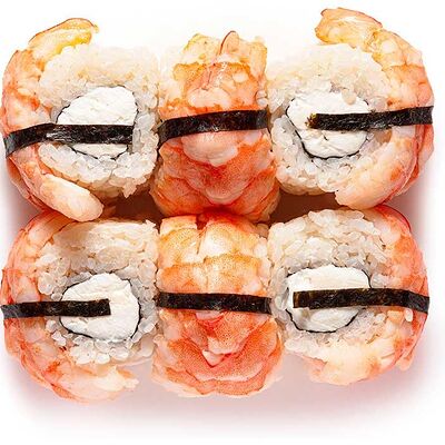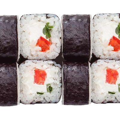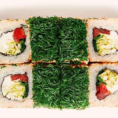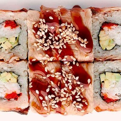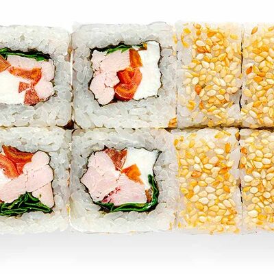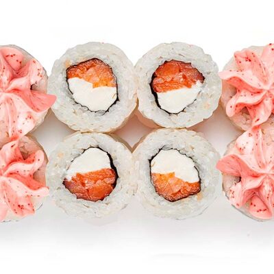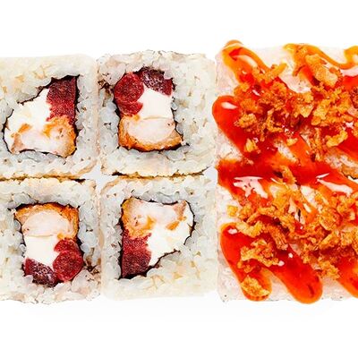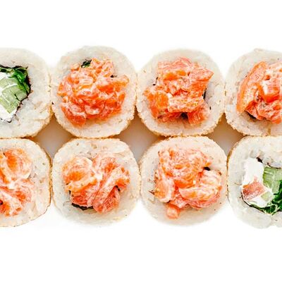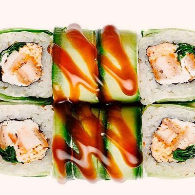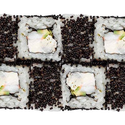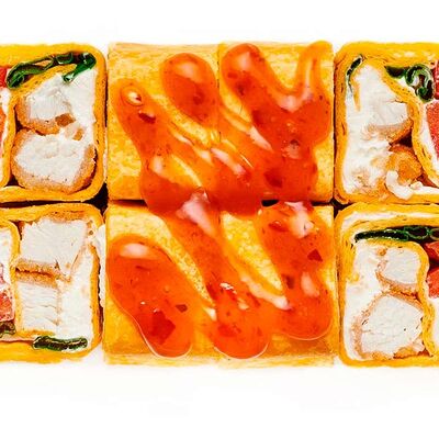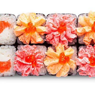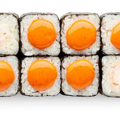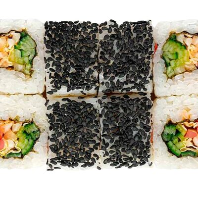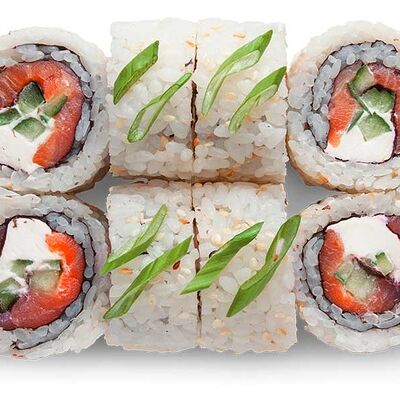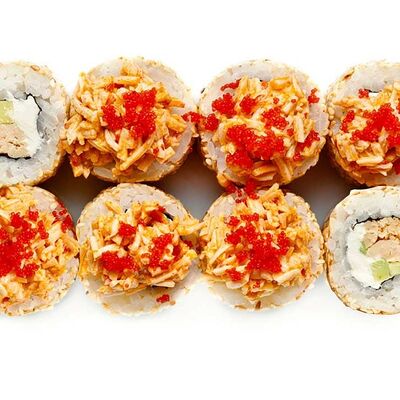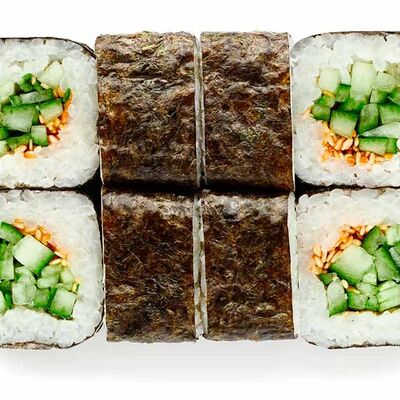 Огурец, тамаго, творожный сыр, соус лава с морским гребешком, рис
