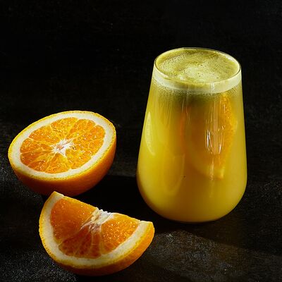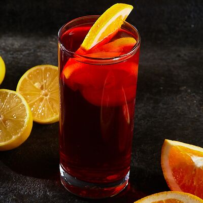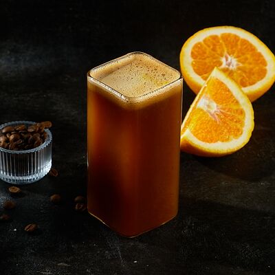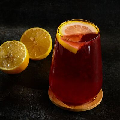 Китайский черный чай, сиропы (черная смородина и перечная мята), концентрат малина, мёд, лимон, горячая вода