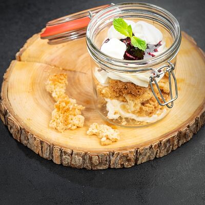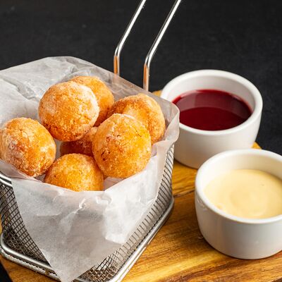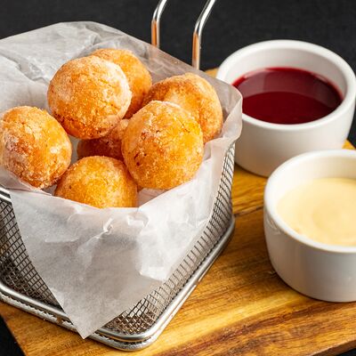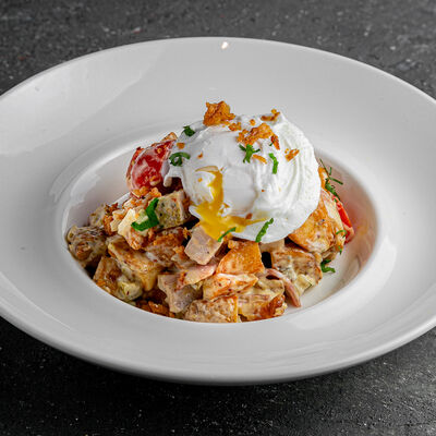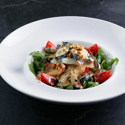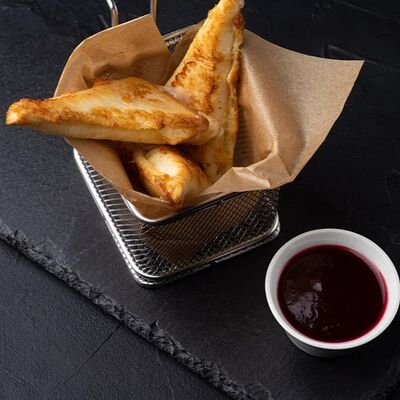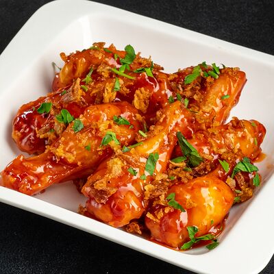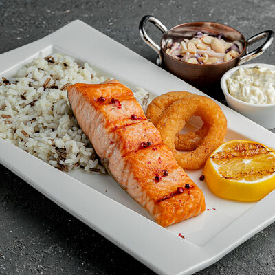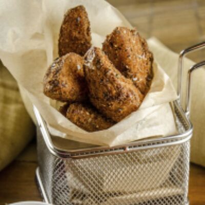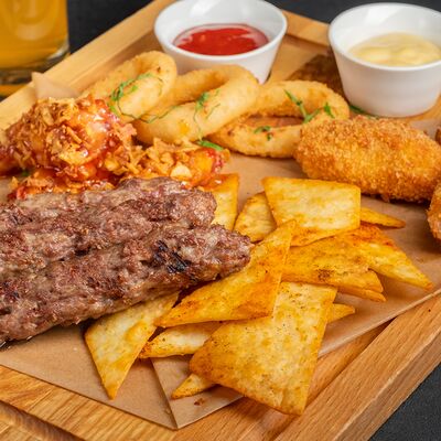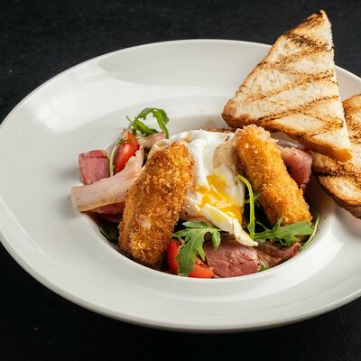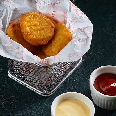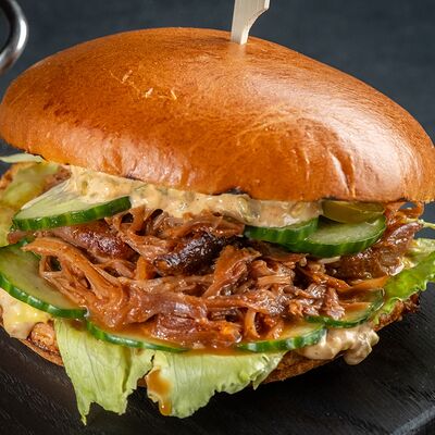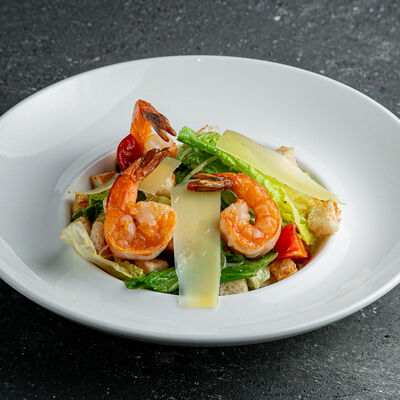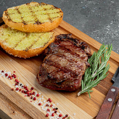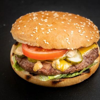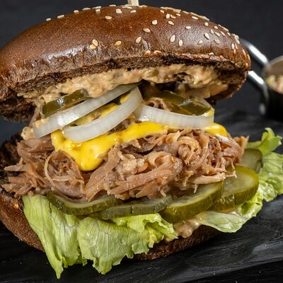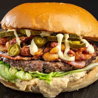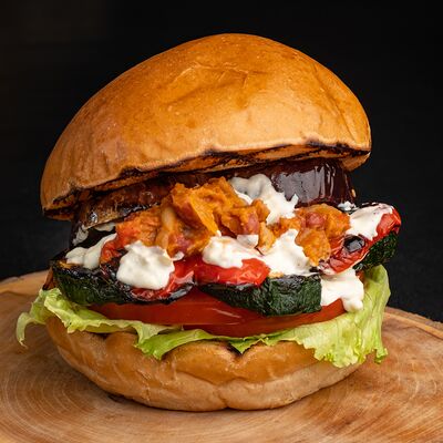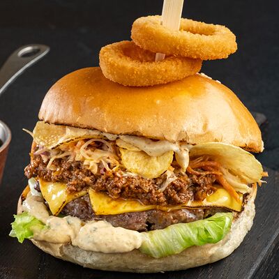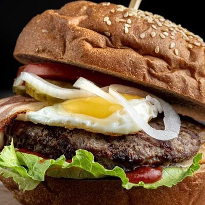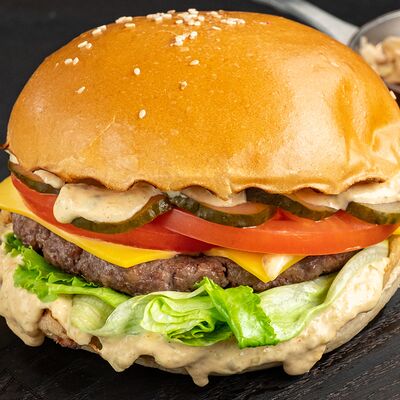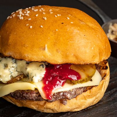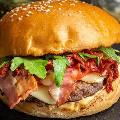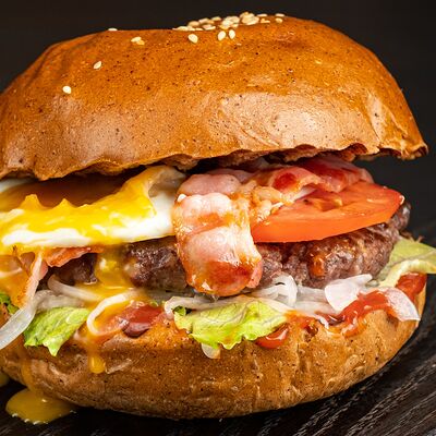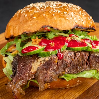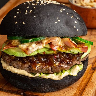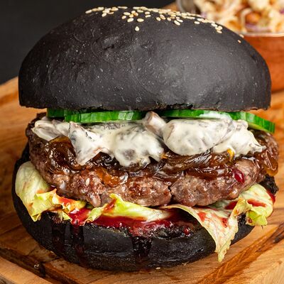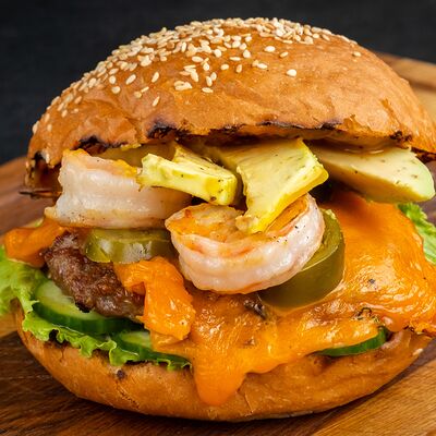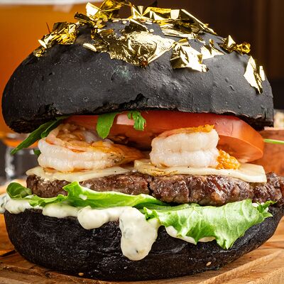 Черная булка, бифштекс из мраморной говядины, королевские креветки, сыр моцарелла, помидоры, руккола, сусальное пищевое золото (1 карат), сладкий соус чили, соус тартар
