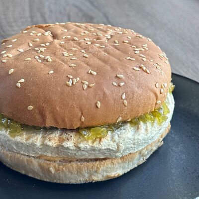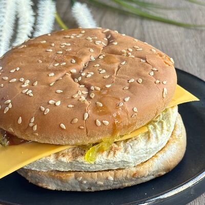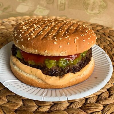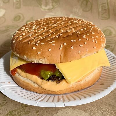 Бифштекс, булочка с кунжутом, салат из огурцов, сыр чеддер, майонез, кетчуп