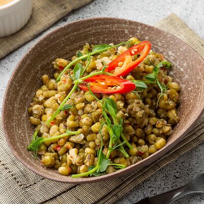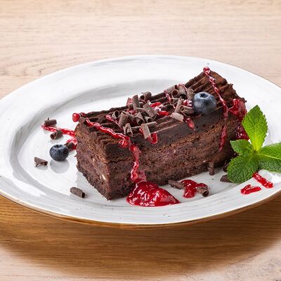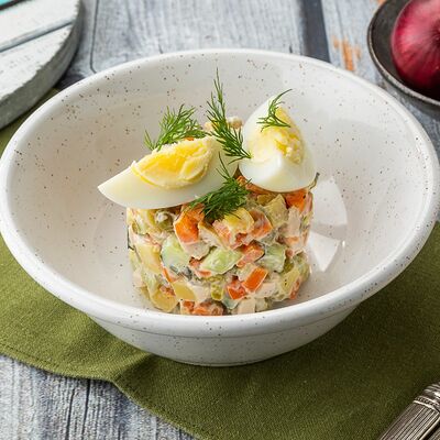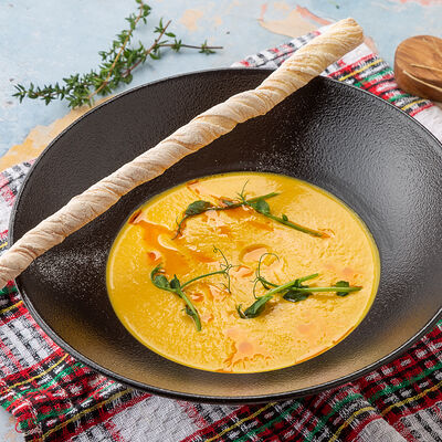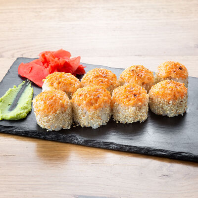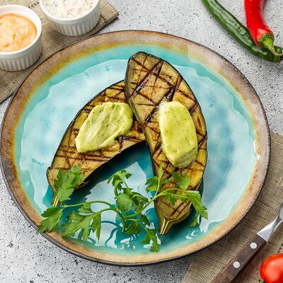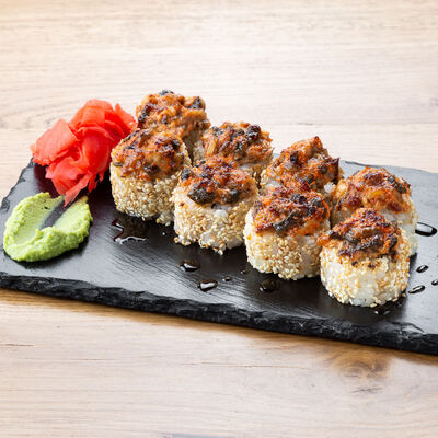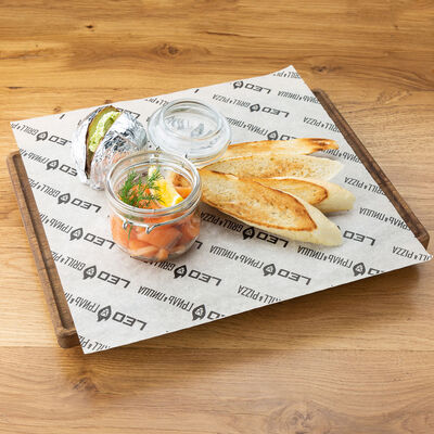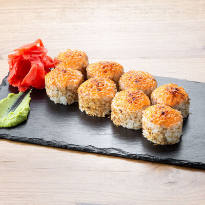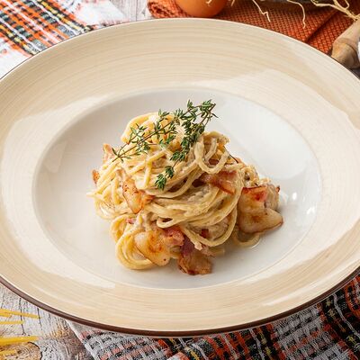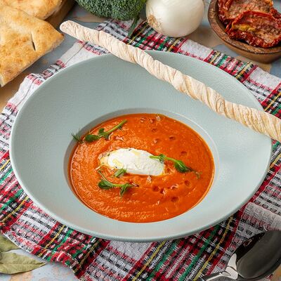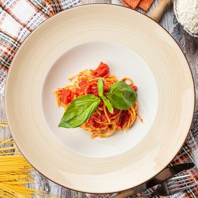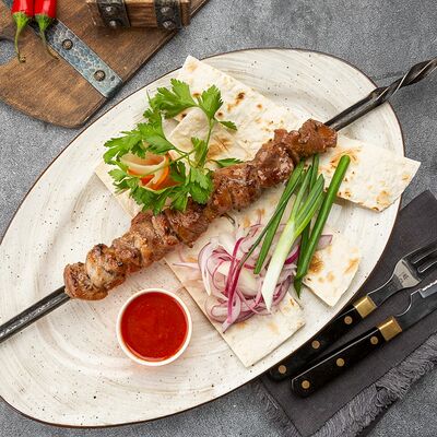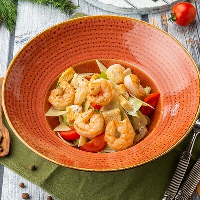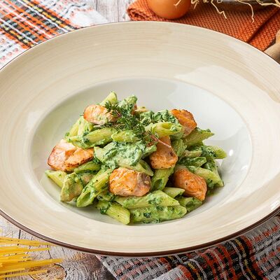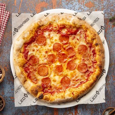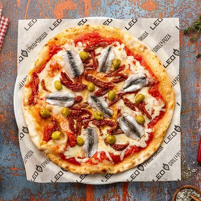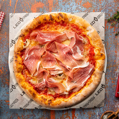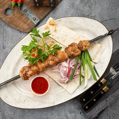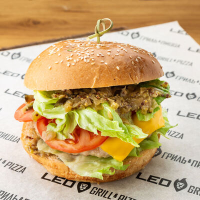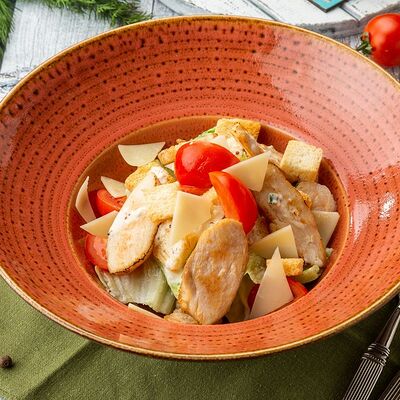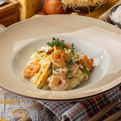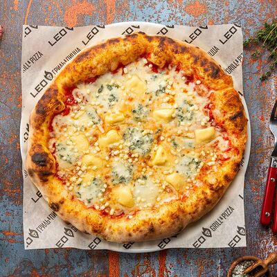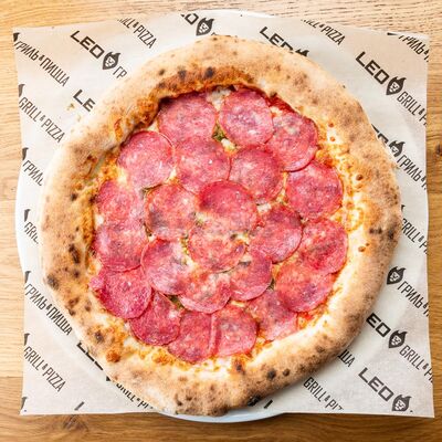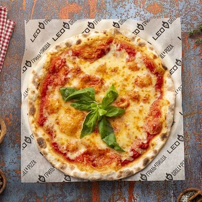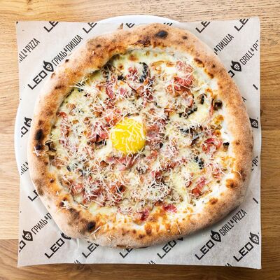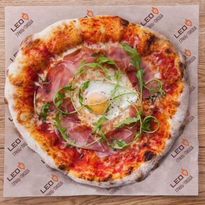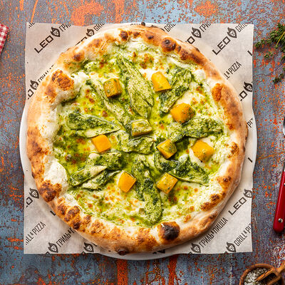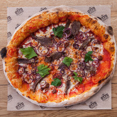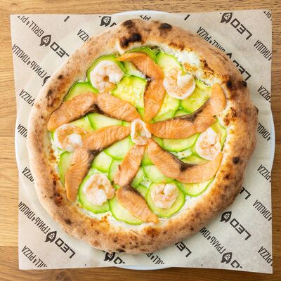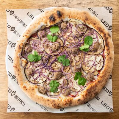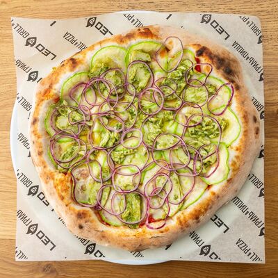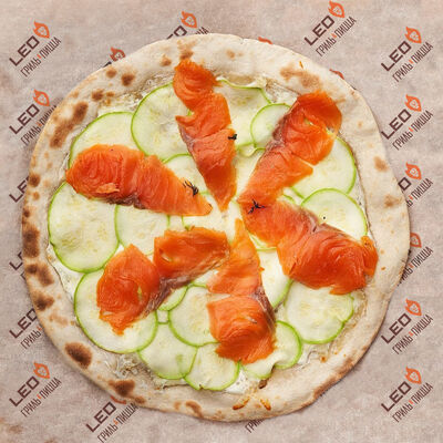 Пшеничное тесто, томатный соус, сыр моцарелла, кусочки куриного филе в соусе, свежий кабачок, красный лук