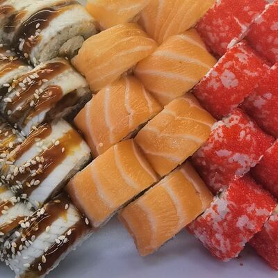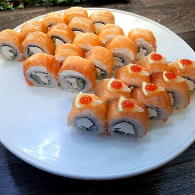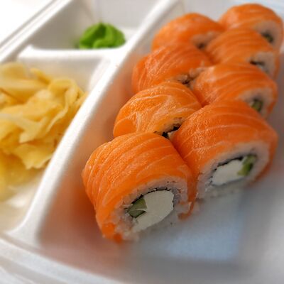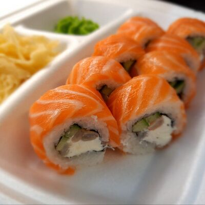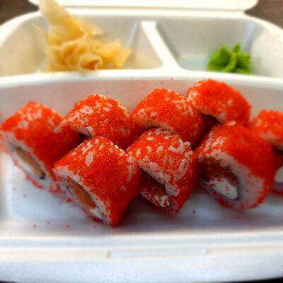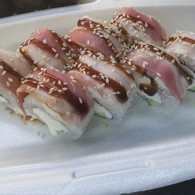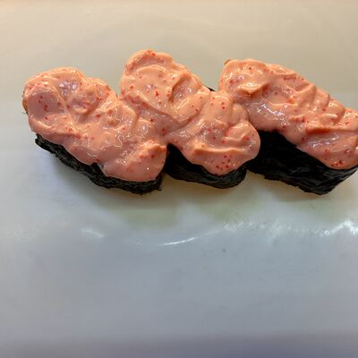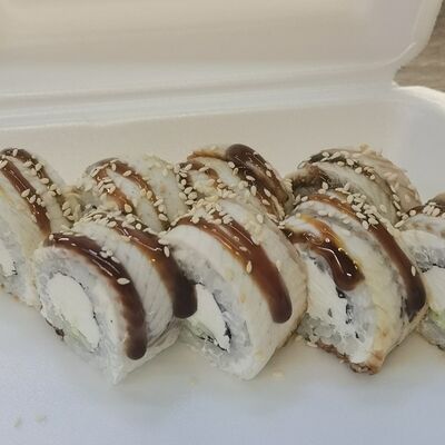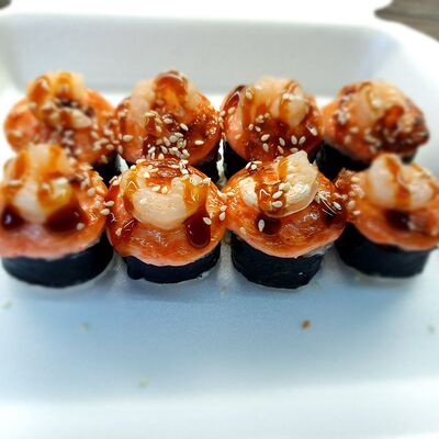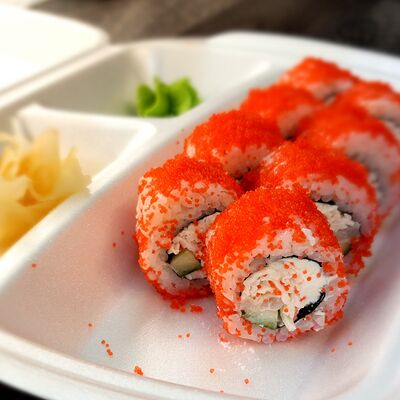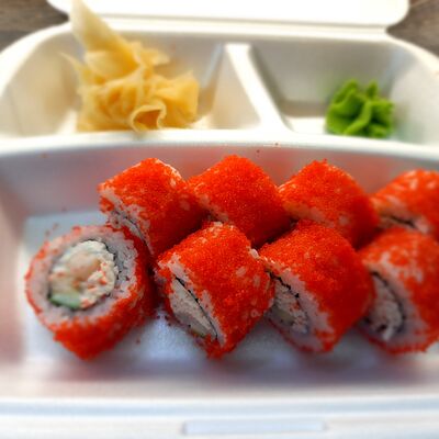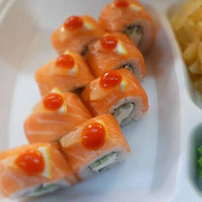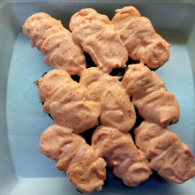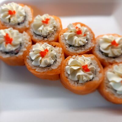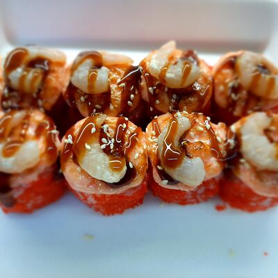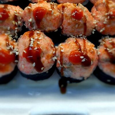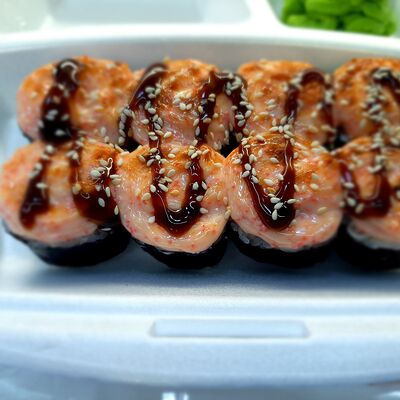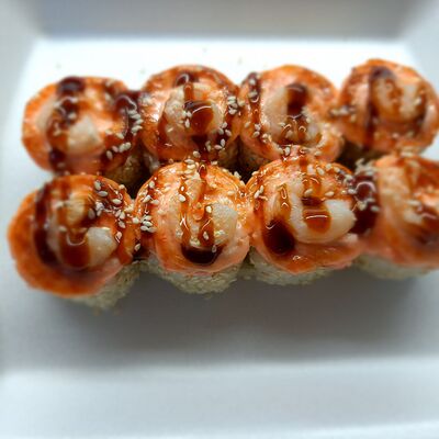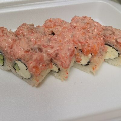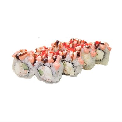 Соус спайси, сливочный сыр, огурец, снежный краб, икра масаго, соус унаги