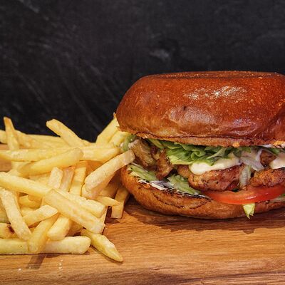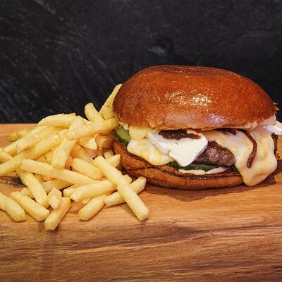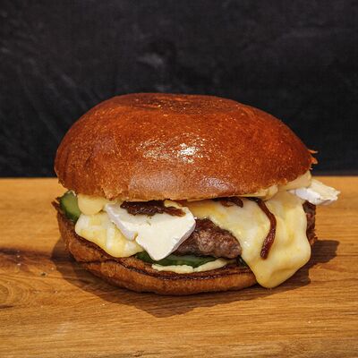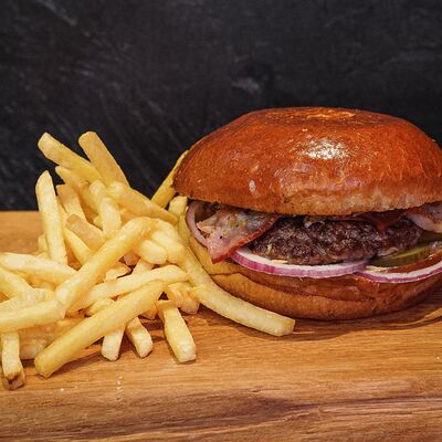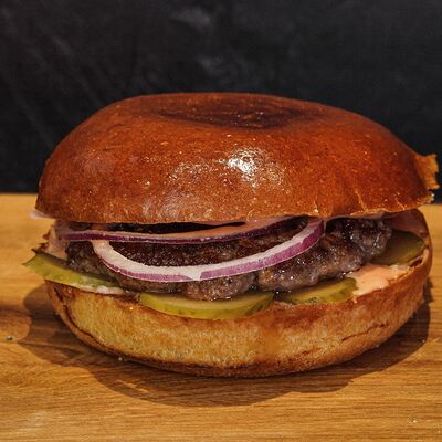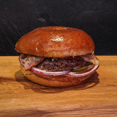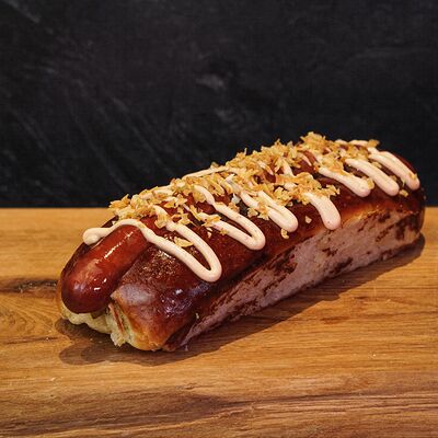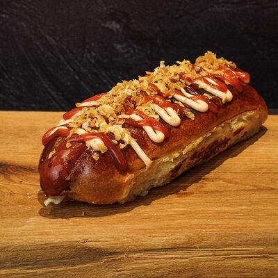 Хот Дог - булочка бриошь, сосиска на гриле, кетчуп, горчица, жаренный сушеный лук, соус релиш