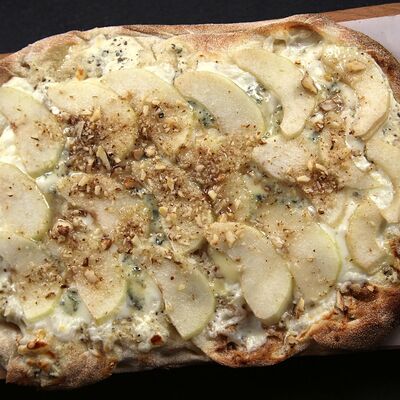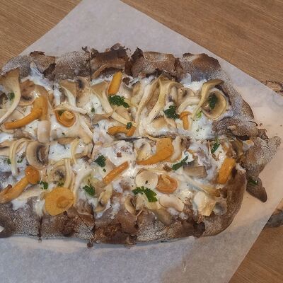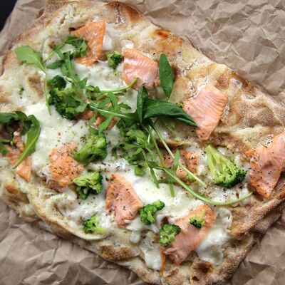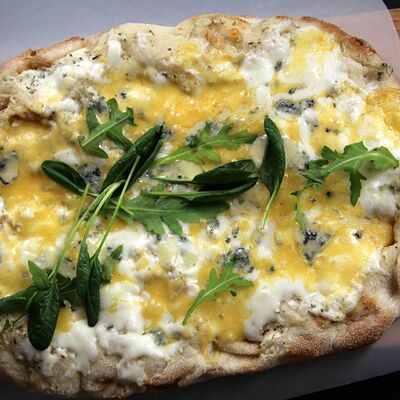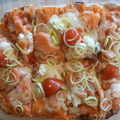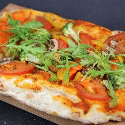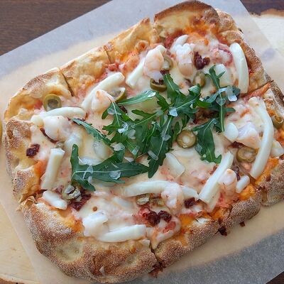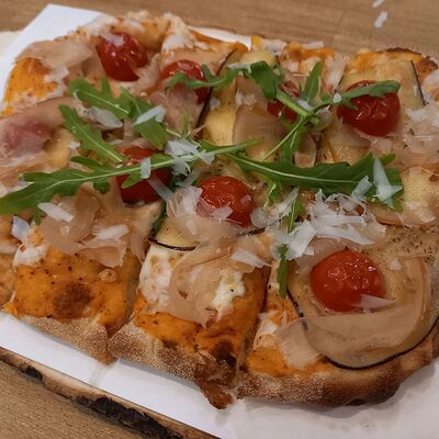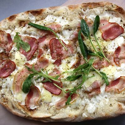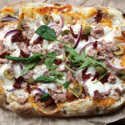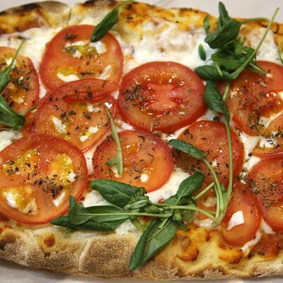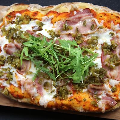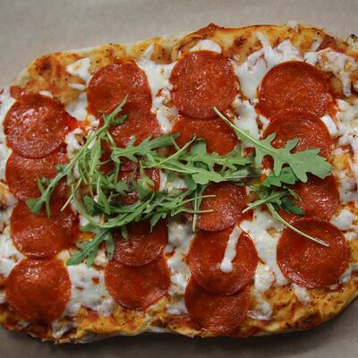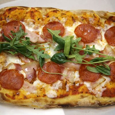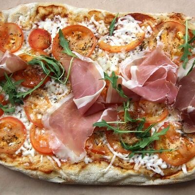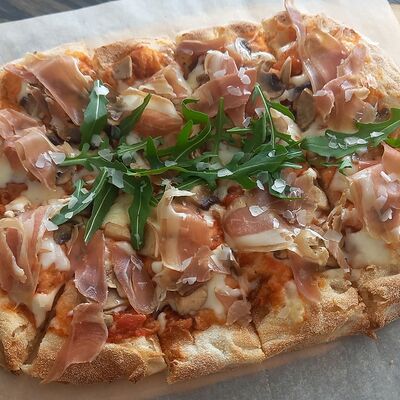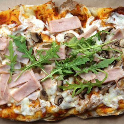 Тесто для римской пиццы, фирменный томатный соус, сыр моцарелла, ветчина из индейки, шампиньоны, руккола, сыр пармезан (20х30 см)