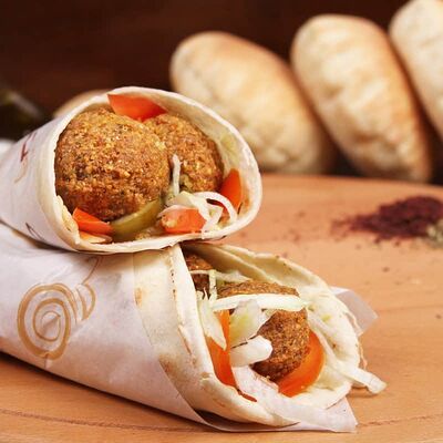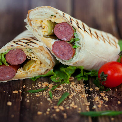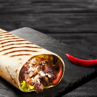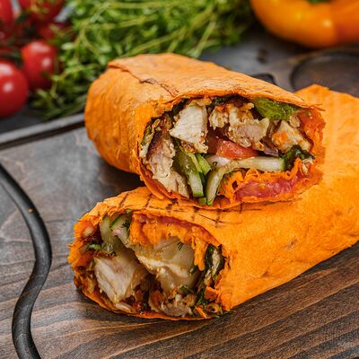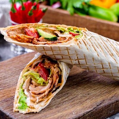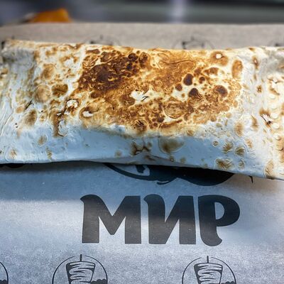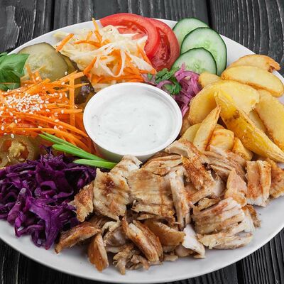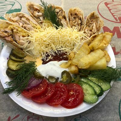 Курица, соус фирменный, лук, соленый огурец, лист салата, лаваш. Отдельно подается картофель, овощи свежие, капуста, лук, морковь