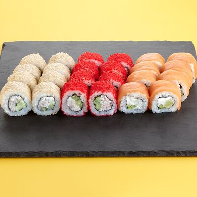 Рис, куриное филе, морковь, шампиньоны консервированные, перец болгарский, фасоль стручковая, капуста, терияки-соус, кунжут, свежий огурец