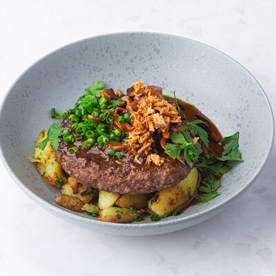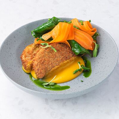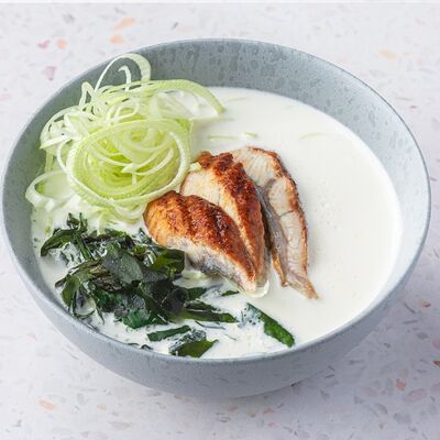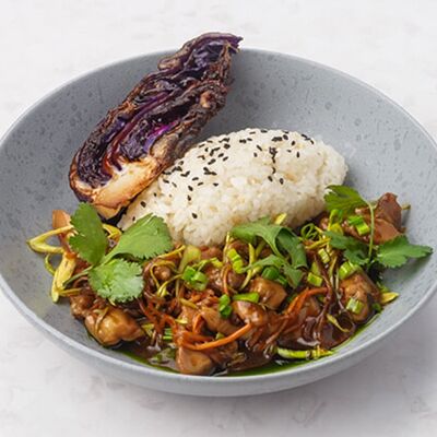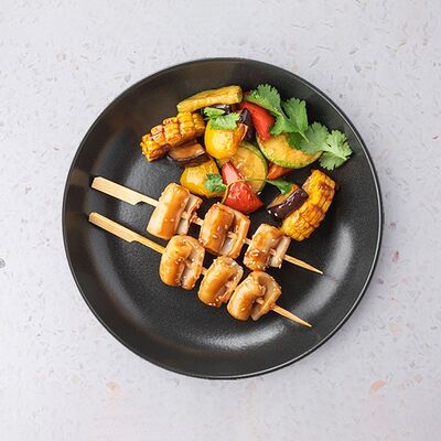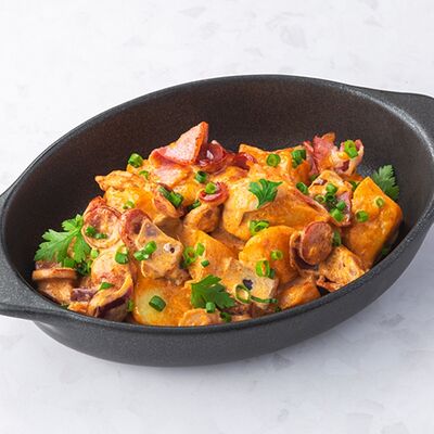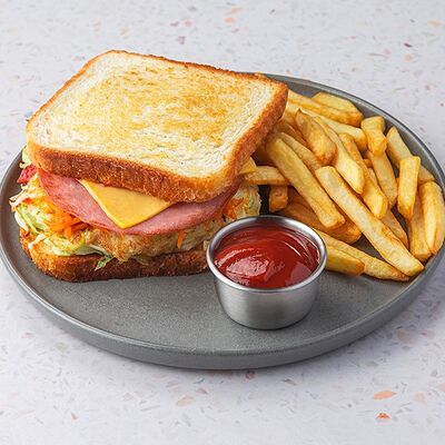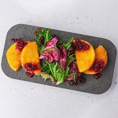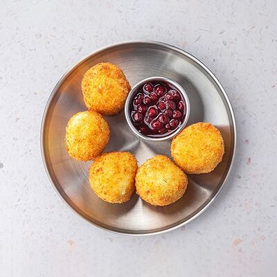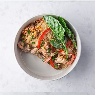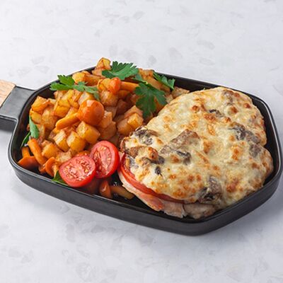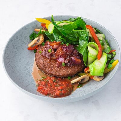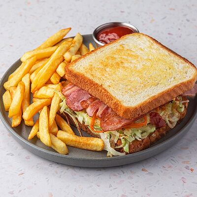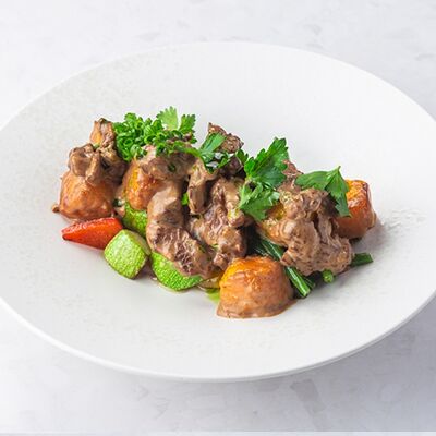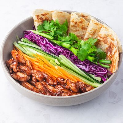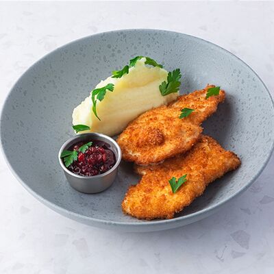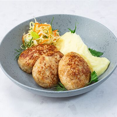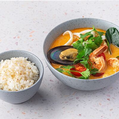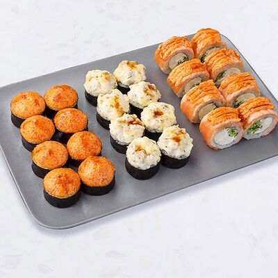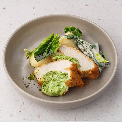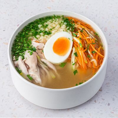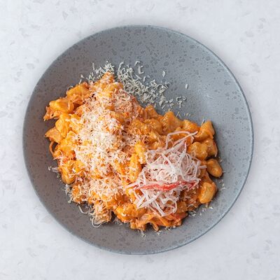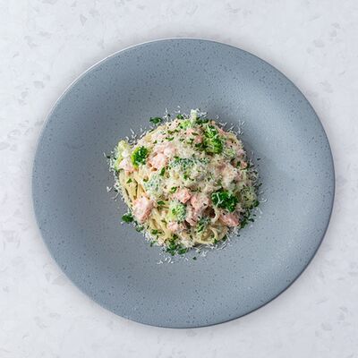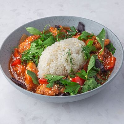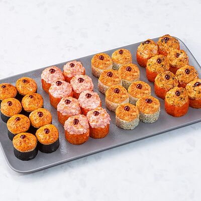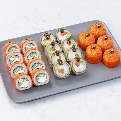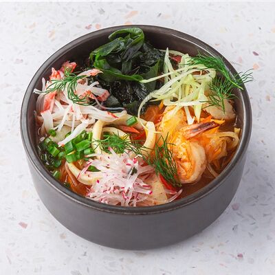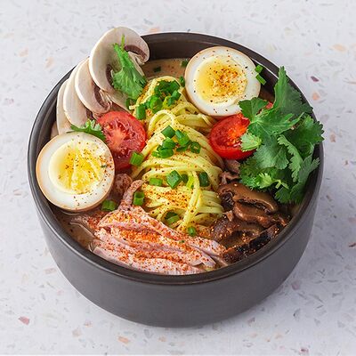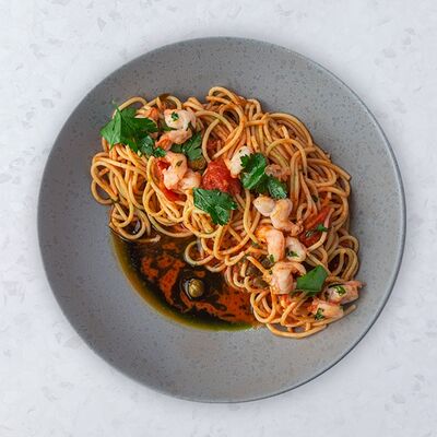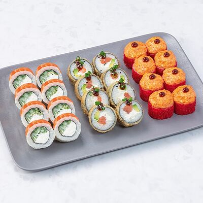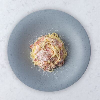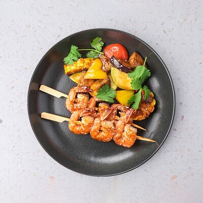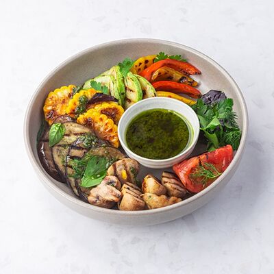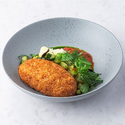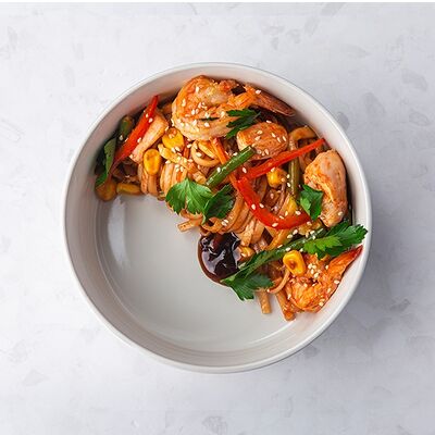 Салат ромейн, салат айсберг, тигровые креветки, яйцо, сыр пармезан, томаты черри, гренки, соус цезарь