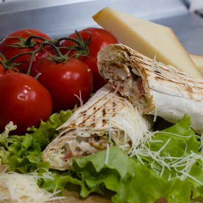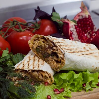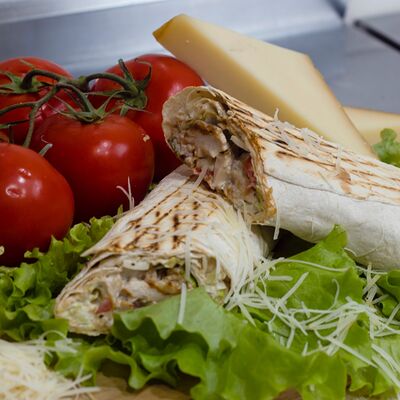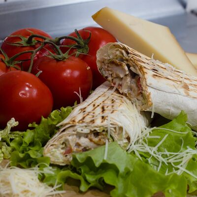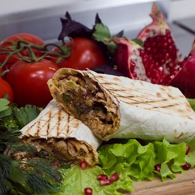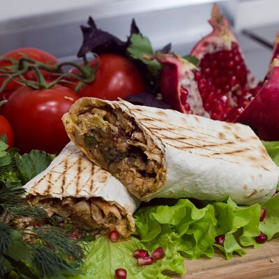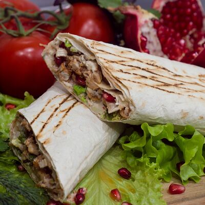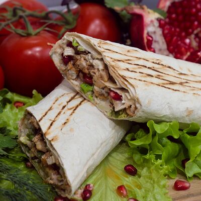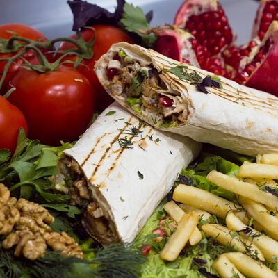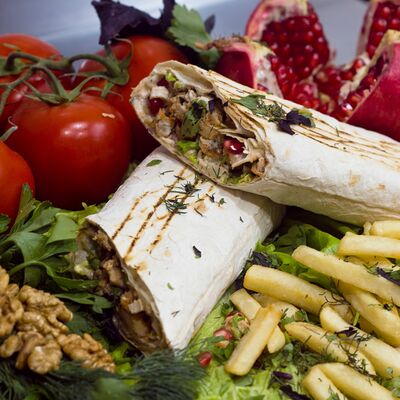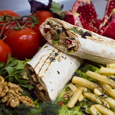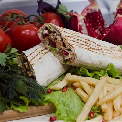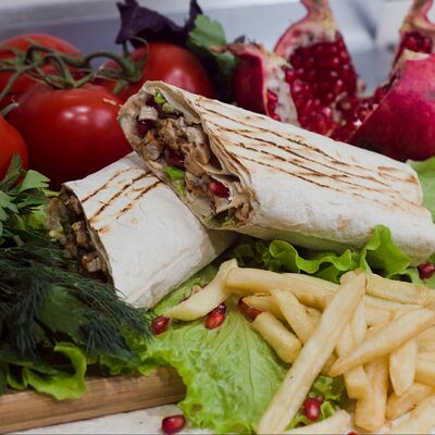 Куриное мясо, салатные листья пекинской капусты, картофель фри, микс свежей зелени, соус чесночно-огуречный с мацони. Авторское блюдо