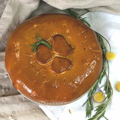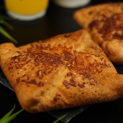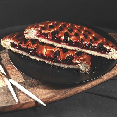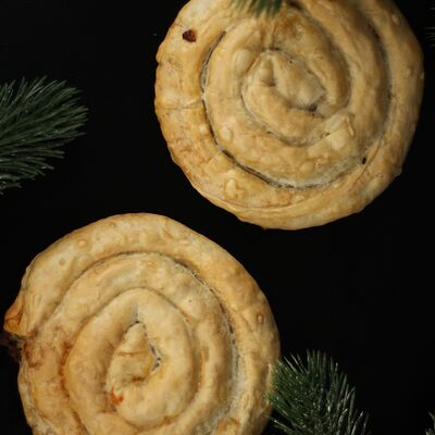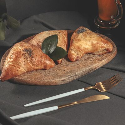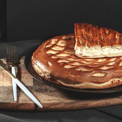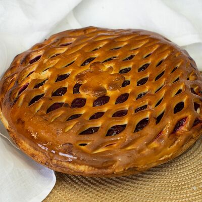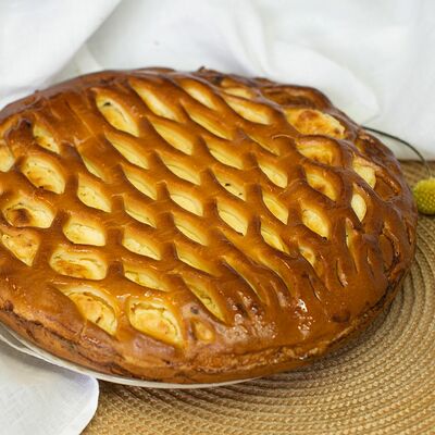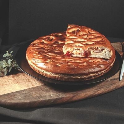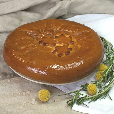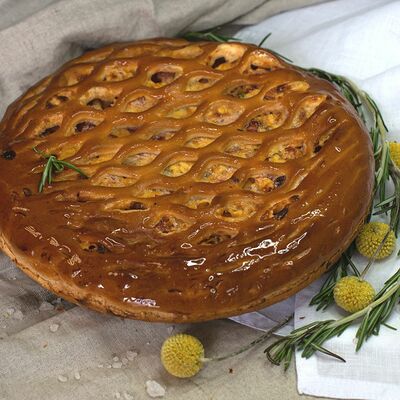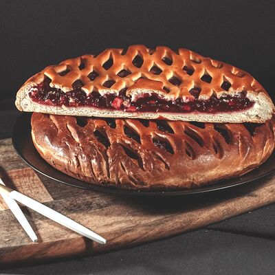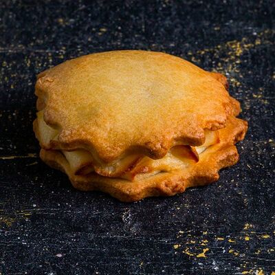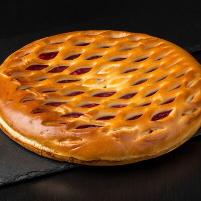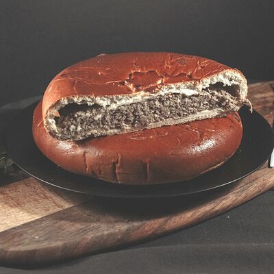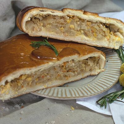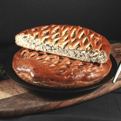 1\2 пирога из сдобного теста с большим количеством начинки из говядины и свинины с добавлением лука и специй