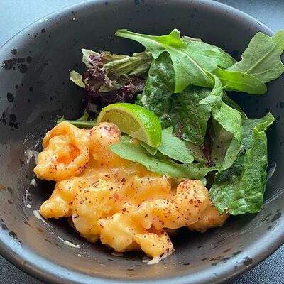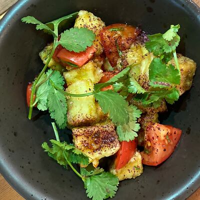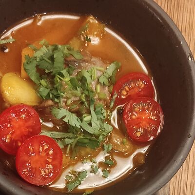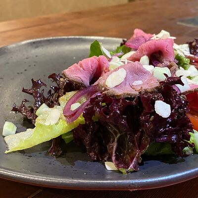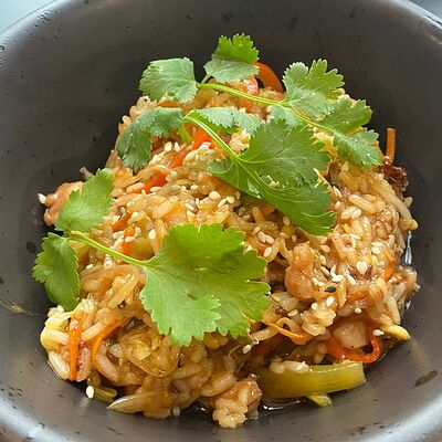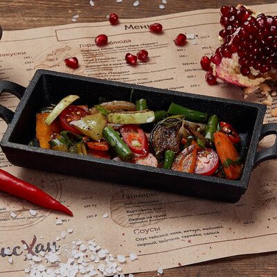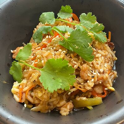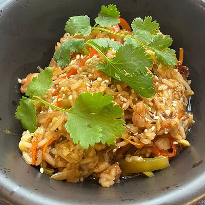 Куриное бедро, пекинская капуста, болгарский перец, лук, морковь, стебель сельдерея, ростки сои, кинза, фирменный соус