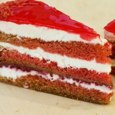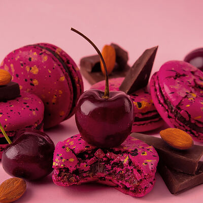 Сахар, мука миндальная (ядра ореха миндаля молотые), пастеризованный яичный белок, шоколад тёмный 55% какао-продуктов (сахар, какао тертое, масло какао, ароматизатор ванилин), вода питьевая, пюре вишни (вишня, сахар), молоко питьевое ультрапастеризованное, масло сливочное 82,5%, шоколад молочный 34% какао-продуктов (сахар, сухое цельное молоко, масло какао, какао тертое, ароматизатор ванилин), сироп глюкозы (из кукурузы, пшеницы)