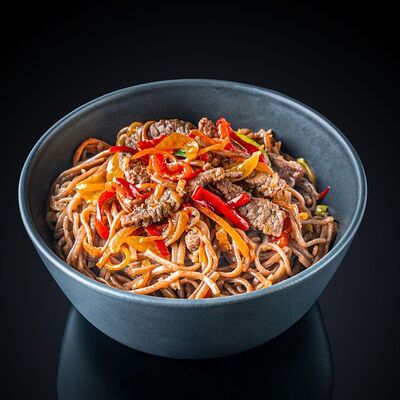 Гречневая лапша, чесночное масло, цукини, морковь, болгарский перец, лук зеленый, лосось, соевый соус, кунжут