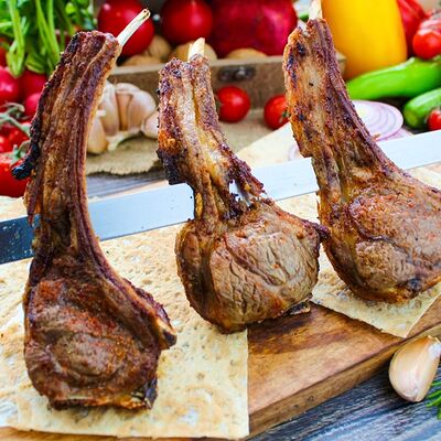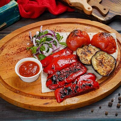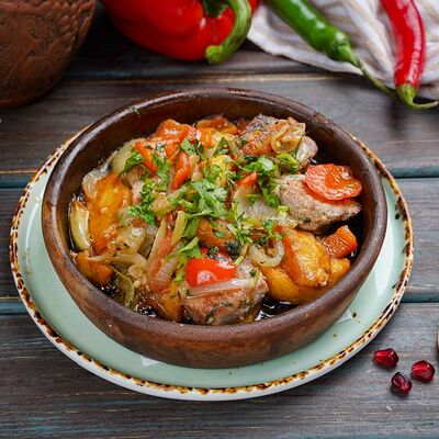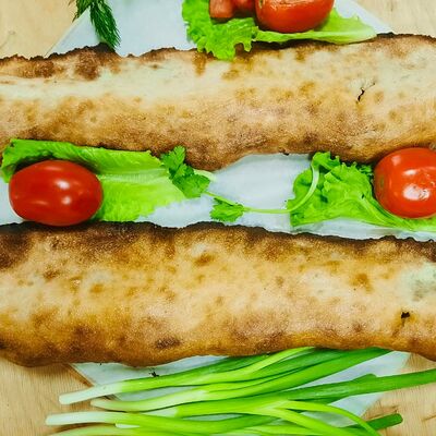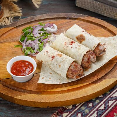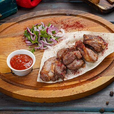 Свинина, говядина, капуста, томаты, огурцы, лаваш, соус сацебели