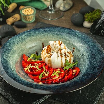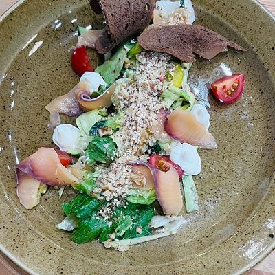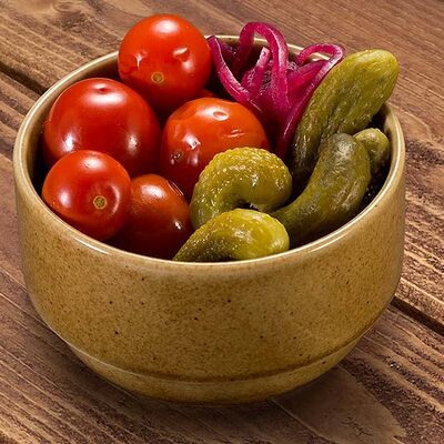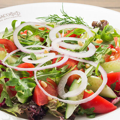 Помидоры, огурцы, микс салатов, редис. Подаётся с оливковым маслом