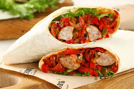 Сочная шаурма в тонком лаваше с кусочками запечённого люля-кебаба из свинины и говядины в сочетании с болгарским перчиком, вялеными томатами, острым перцем Халапеньо и двумя видами соуса — ремесленным майонезом и кетчупом из протёртых томатов.