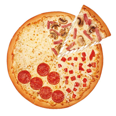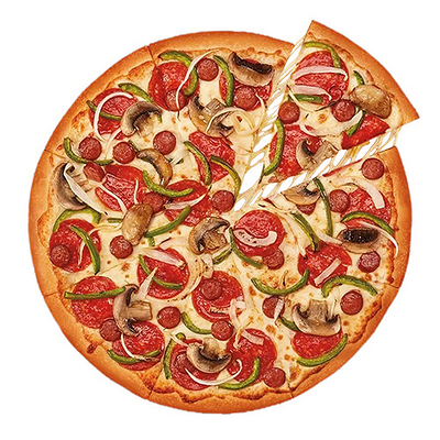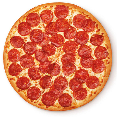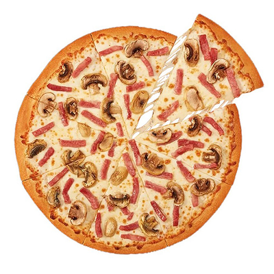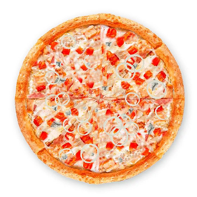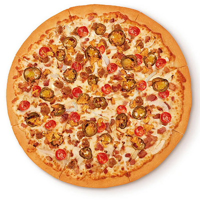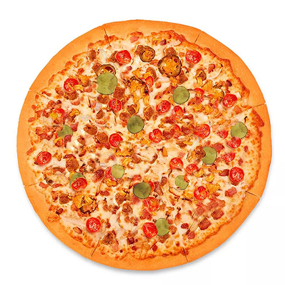 Тесто дрожжевое, cоус томатный, сыр Моцарелла, пепперони, охотничьи колбаски, лук, грибы шампиньоны, болгарский перец (30 см)
