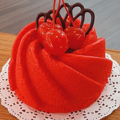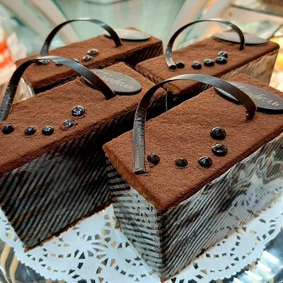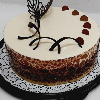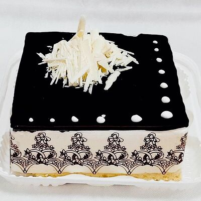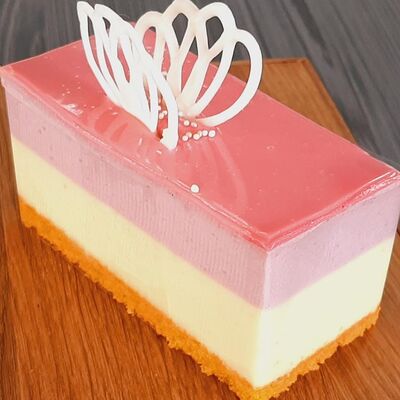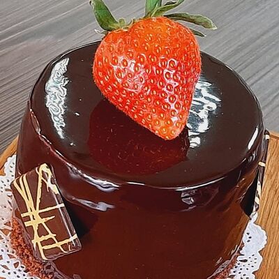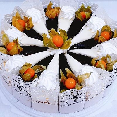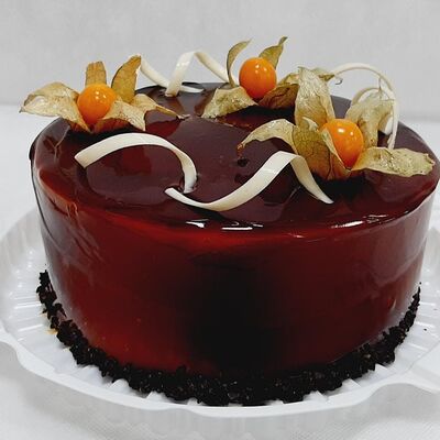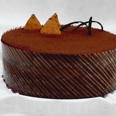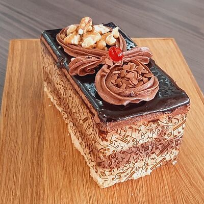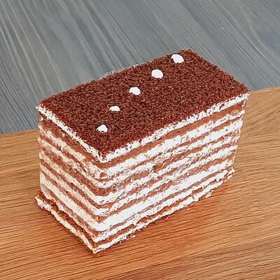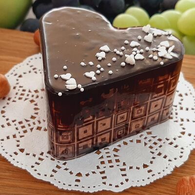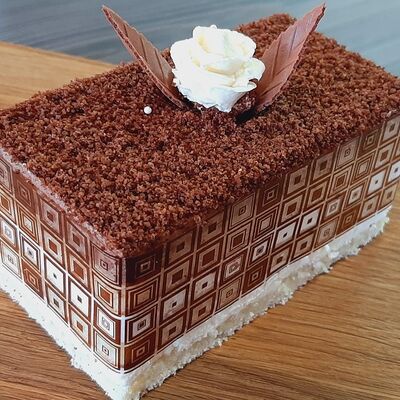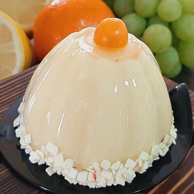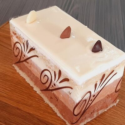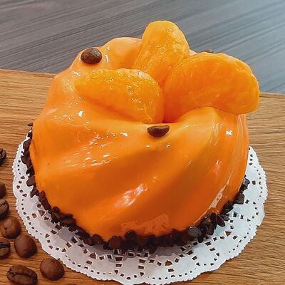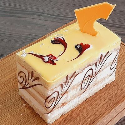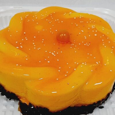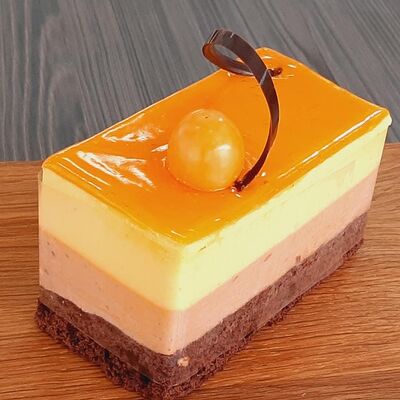 Пирожное состоит из шоколадного плотного бисквита и двух видов мусса (шоколадный мусс, манговый мусс). Этот торт окунет вас в атмосферу солнечного лета