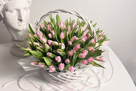 Тюльпан розовый 101 (шт.), оазис, корзина белая плетённая